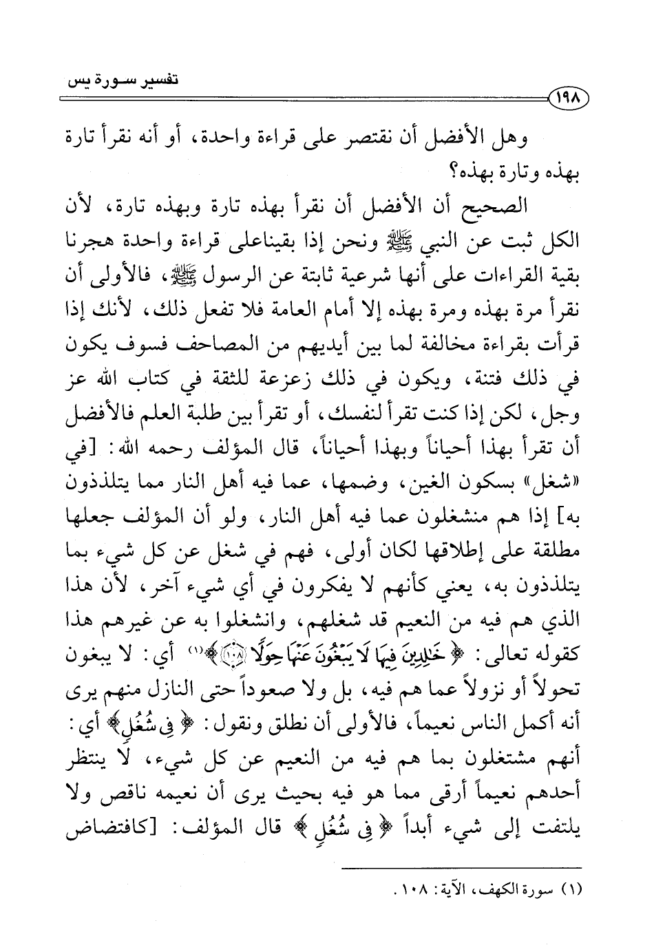 الصحيح أن الأفضل أن نقرأ بهذه تارة وبهذه تارة، لأن الكل ثبت عن النبي - صلى الله عليه وسلم - ونحن إذا بقينا على قراءة واحدة هجرنا بقية القراءات على أنها شرعية ثابتة عن الرسول - صلى الله عليه وسلم -، فالأولى أن نقرأ مرة بهذه ومرة بهذه إلا أمام العامة فلا تفعل ذلك، لأنك إذًا قرأت بقراءة مخالفة لما بين أيديهم من المصاحف فسوف يكون في ذلك فتنة، ويكون في ذلك زعزعة للثقة في كتاب الله عز وجل، لكن إذا كنت تقرأ لنفسك، أو تقرأ بين طلبة العلم فالأفضل أن تقرأ بهذا أحيانًا وبهذا أحيانًا، قال المؤلف رحمه الله: [في "شغل" بسكون الغين، وضمها، عما فيه أهل النار مما يتلذذون به، إذا هم منشغلون عما فيه أهل النار، ولو أن المؤلف جعلها مطلقة على إطلاقها لكان أولى، فهم في شغل عن كل شيء بما يتلذذون به، يعني كأنهم لا يفكرون في أي شيء آخر، لأن هذا الذي هم فيه من النعيم قد شغلهم، وانشغلوا به عن غيرهم هذا كقوله تعالى: {خَالِدِينَ فِيهَا لَا يَبْغُونَ عَنْهَا حِوَلًا (١٠٨)} (¬١) أي: لا يبغون تحولًا أو نزولًا عما هم فيه، بل ولا صعودًا حتى النازل منهم يرى أنه أكمل الناس نعيمًا، فالأولى أن نطلق ونقول: {فِي شُغُلٍ} أي: أنهم مشتغلون بما هم فيه من النعيم عن كل شيء، لا ينتظر أحدهم نعيمًا أرقى مما هو فيه بحيث يرى أن نعيمه ناقص ولا يلتفت إلى شيء أبدًا {فِي شُغُلٍ} قال المؤلف: [كافتضاض
