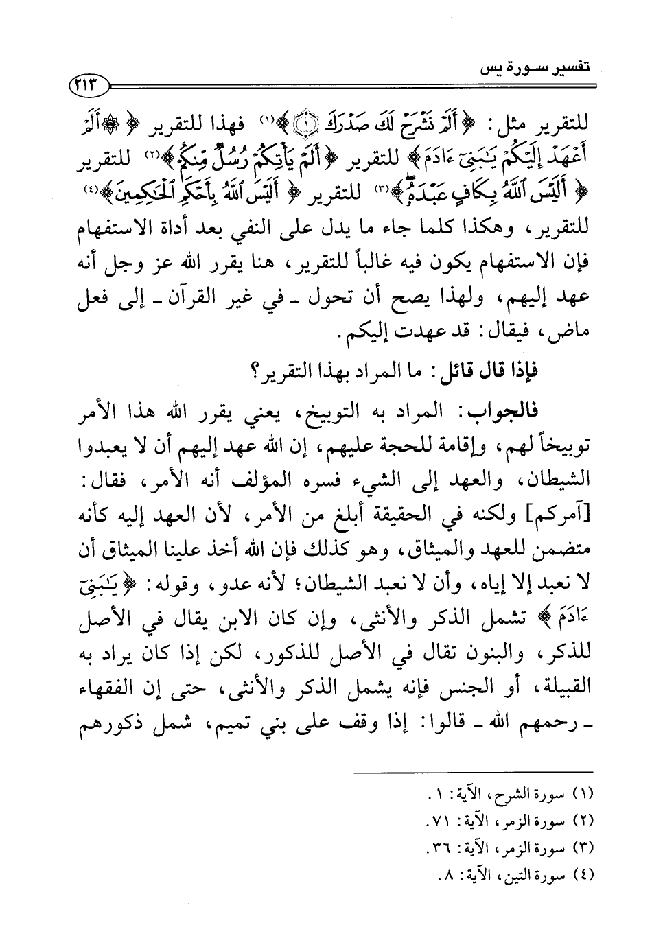للتقرير مثل: {أَلَمْ نَشْرَحْ لَكَ صَدْرَكَ (١)} (¬١) فهذا للتقرير {أَلَمْ أَعْهَدْ إِلَيْكُمْ يَابَنِي آدَمَ} للتقرير {أَلَمْ يَأْتِكُمْ رُسُلٌ مِنْكُمْ} (¬٢) للتقرير {أَلَيْسَ اللَّهُ بِكَافٍ عَبْدَهُ} (¬٣) للتقرير {أَلَيْسَ اللَّهُ بِأَحْكَمِ الْحَاكِمِينَ} (¬٤) للتقرير، وهكذا كلما جاء ما يدل على النفي بعد أداة الاستفهام فإن الاستفهام يكون فيه غالبًا للتقرير، هنا يقرر الله عز وجل أنه عهد إليهم، ولهذا يصح أن تحول -في غير القرآن- إلى فعل ماض، فيقال: قد عهدت إليكم.