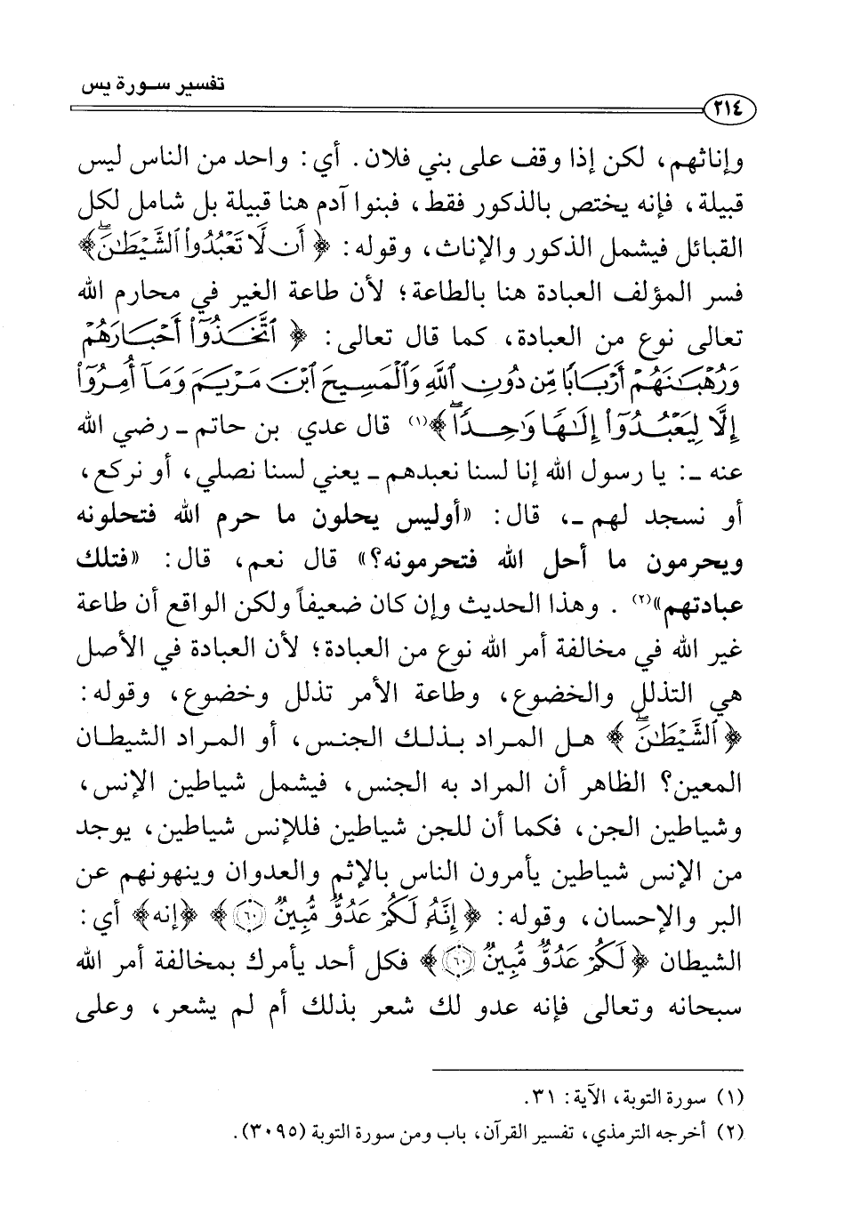 وإناثهم، لكن إذا وقف على بني فلان. أي: واحد من الناس ليس قبيلة، فإنه يختص بالذكور فقط، فبنوا آدم هنا قبيلة بل شامل لكل القبائل فيشمل الذكور والإناث، وقوله: {أَنْ لَا تَعْبُدُوا الشَّيْطَانَ} فسر المؤلف العبادة هنا بالطاعة؛ لأن طاعة الغير في محارم الله تعالى نوع من العبادة، كما قال تعالى: {اتَّخَذُوا أَحْبَارَهُمْ وَرُهْبَانَهُمْ أَرْبَابًا مِنْ دُونِ اللَّهِ وَالْمَسِيحَ ابْنَ مَرْيَمَ وَمَا أُمِرُوا إِلَّا لِيَعْبُدُوا إِلَهًا وَاحِدًا} (¬١) قال عدي بن حاتم -رضي الله عنه-: يا رسول الله إنا لسنا نعبدهم -يعني لسنا نصلي، أو نركع، أو نسجد لهم-، قال: "أوليس يحلون ما حرم الله فتحلونه ويحرمون ما أحل الله فتحرمونه؟ " قال نعم، قال: "فتلك عبادتهم" (¬٢). وهذا الحديث وإن كان ضعيفًا ولكن الواقع أن طاعة غير الله في مخالفة أمر الله نوع من العبادة؛ لأن العبادة في الأصل هي التذلل والخضوع، وطاعة الأمر تذلل وخضوع، وقوله: {الشَّيْطَانَ} هل المراد بذلك الجنس، أو المراد الشيطان المعين؟ الظاهر أن المراد به الجنس، فيشمل شياطين الإنس، وشياطين الجن، فكما أن للجن شياطين فللإنس شياطين، يوجد من الإنس شياطين يأمرون الناس بالإثم والعدوان وينهونهم عن البر والإحسان، وقوله: {إِنَّهُ لَكُمْ عَدُوٌّ مُبِينٌ (٦٠)} {إِنَّهُ} أي: الشيطان {لَكُمْ عَدُوٌّ مُبِينٌ (٦٠)} فكل أحد يأمرك بمخالفة أمر الله سبحانه وتعالى فإنه عدو لك شعر بذلك أم لم يشعر، وعلى