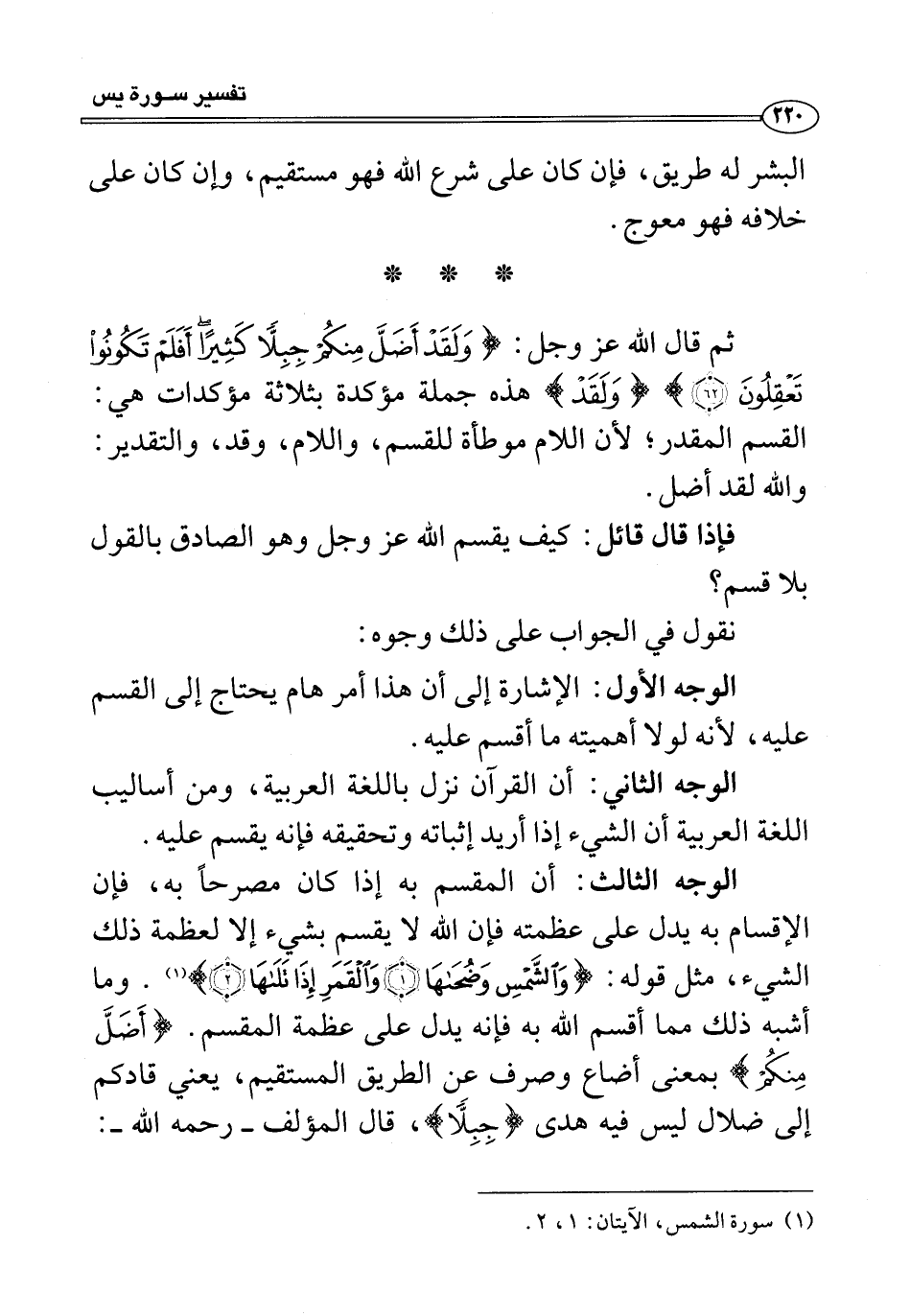 الوجه الثالث: أن المقسم به إذا كان مصرحًا به، فإن الإقسام به يدل على عظمته فإن الله لا يقسم بشيء إلا لعظمة ذلك الشيء، مثل قوله: {وَالشَّمْسِ وَضُحَاهَا (١) وَالْقَمَرِ إِذَا تَلَاهَا (٢)} (¬١). وما أشبه ذلك مما أقسم الله به فإنه يدل على عظمة المقسم. {أَضَلَّ مِنْكُمْ} بمعنى أضاع وصرف عن الطريق المستقيم، يعني قادكم إلى ضلال ليس فيه هدى {جِبِلًّا}، قال المؤلف -رحمه الله-: