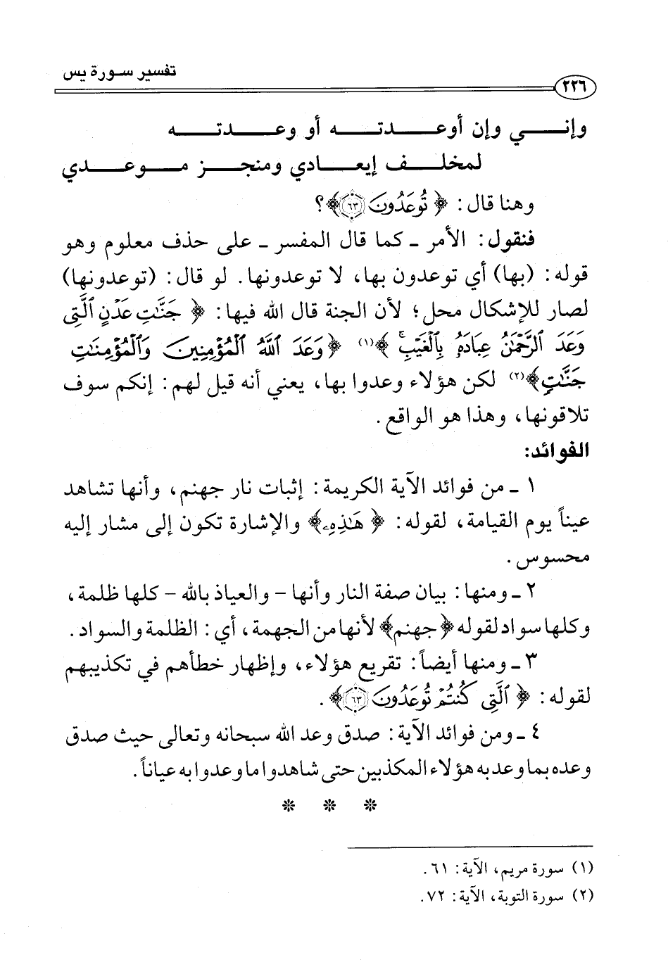 ٣ - ومنها أيضًا: تقريع هؤلاء، وإظهار خطأهم في تكذيبهم لقوله: {الَّتِي كُنْتُمْ تُوعَدُونَ (٦٣)}.