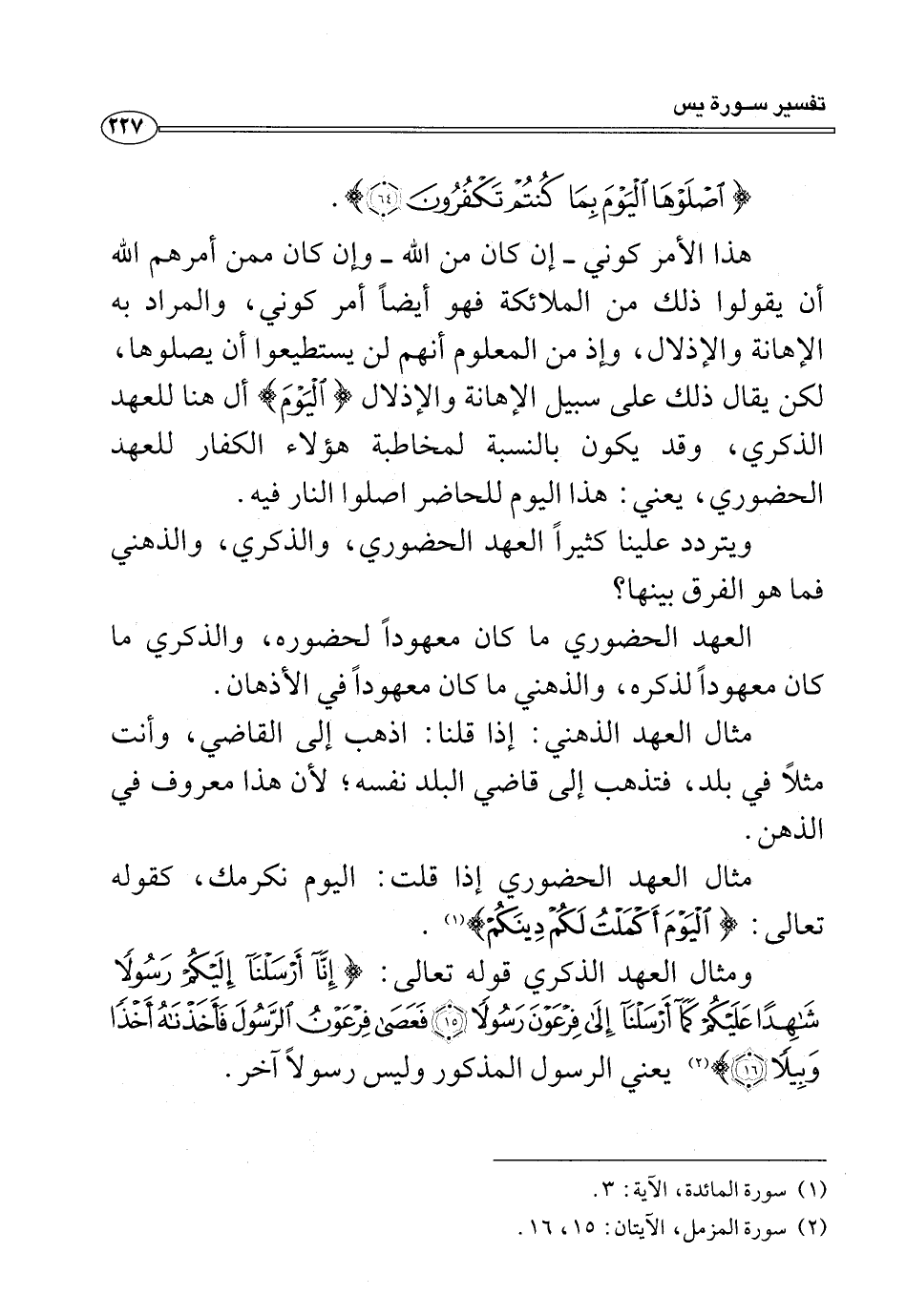ومثال العهد الذكري قوله تعالى: {إِنَّا أَرْسَلْنَا إِلَيْكُمْ رَسُولًا شَاهِدًا عَلَيْكُمْ كَمَا أَرْسَلْنَا إِلَى فِرْعَوْنَ رَسُولًا (١٥) فَعَصَى فِرْعَوْنُ الرَّسُولَ فَأَخَذْنَاهُ أَخْذًا وَبِيلًا (١٦)} (¬٢) يعني الرسول المذكور وليس رسولًا آخر.