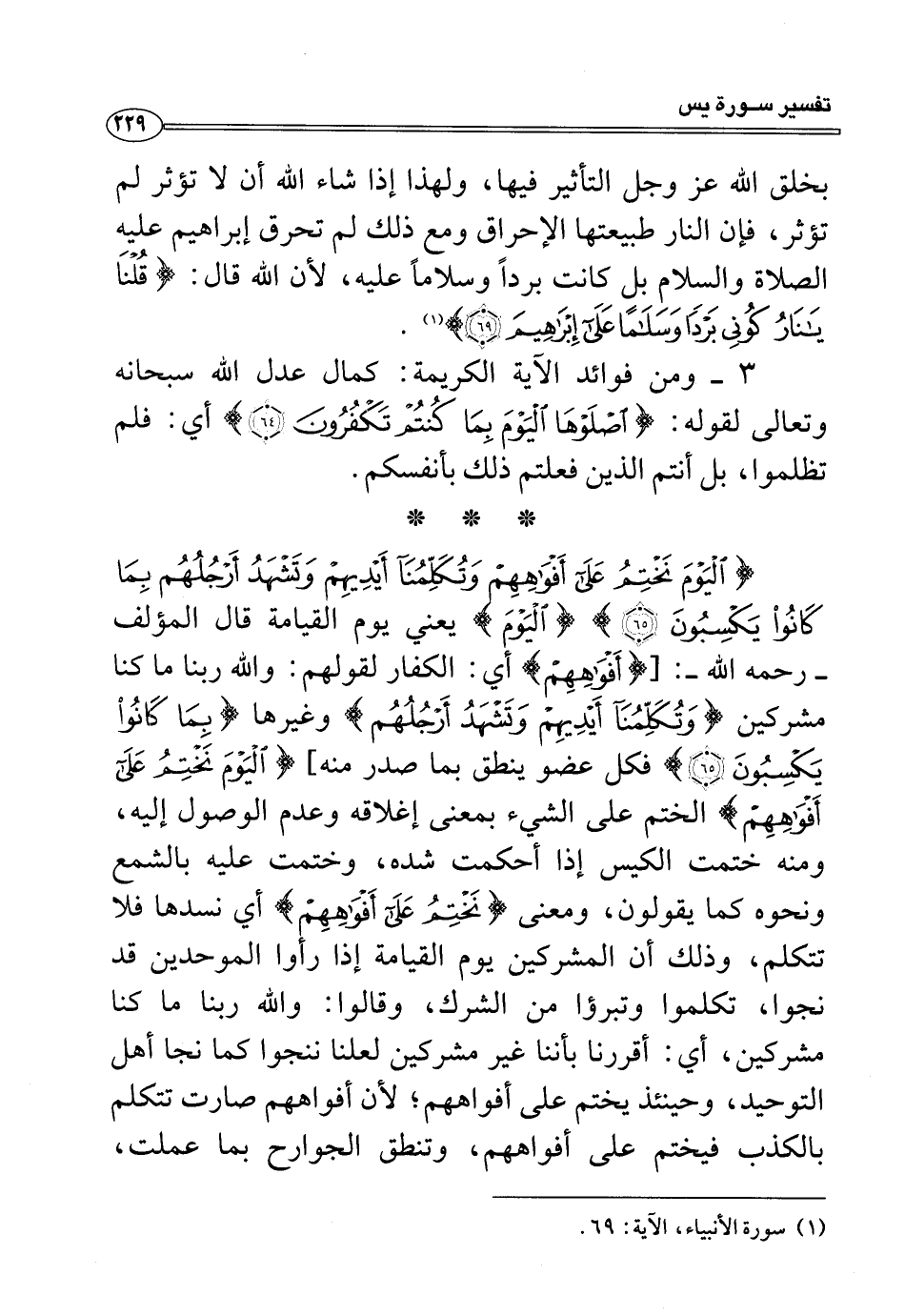 {الْيَوْمَ نَخْتِمُ عَلَى أَفْوَاهِهِمْ وَتُكَلِّمُنَا أَيْدِيهِمْ وَتَشْهَدُ أَرْجُلُهُمْ بِمَا كَانُوا يَكْسِبُونَ (٦٥)} {الْيَوْمَ} يعني يوم القيامة قال المؤلف -رحمه الله-: [{أَفْوَاهِهِمْ} أي: الكفار لقولهم: والله ربنا ما كنا مشركين {وَتُكَلِّمُنَا أَيْدِيهِمْ وَتَشْهَدُ أَرْجُلُهُمْ} وغيرها {بِمَا كَانُوا يَكْسِبُونَ (٦٥)} فكل عضو ينطق بما صدر منه {الْيَوْمَ نَخْتِمُ عَلَى أَفْوَاهِهِمْ} الختم على الشيء بمعنى إغلاقه وعدم الوصول إليه، ومنه ختمت الكيس إذا أحكمت شده، وختمت عليه بالشمع ونحوه كما يقولون، ومعنى {نَخْتِمُ عَلَى أَفْوَاهِهِمْ} أي نسدها فلا تتكلم، وذلك أن المشركين يوم القيامة إذا رأوا الموحدين قد نجوا، تكلموا وتبرؤا من الشرك، وقالوا: والله ربنا ما كنا مشركين، أي: أقررنا بأننا غير مشركين لعلنا ننجوا كما نجا أهل التوحيد، وحينئذ يختم على أفواههم، لأن أفواههم صارت تتكلم بالكذب فيختم على أفواههم، وتنطق الجوارح بما عملت،