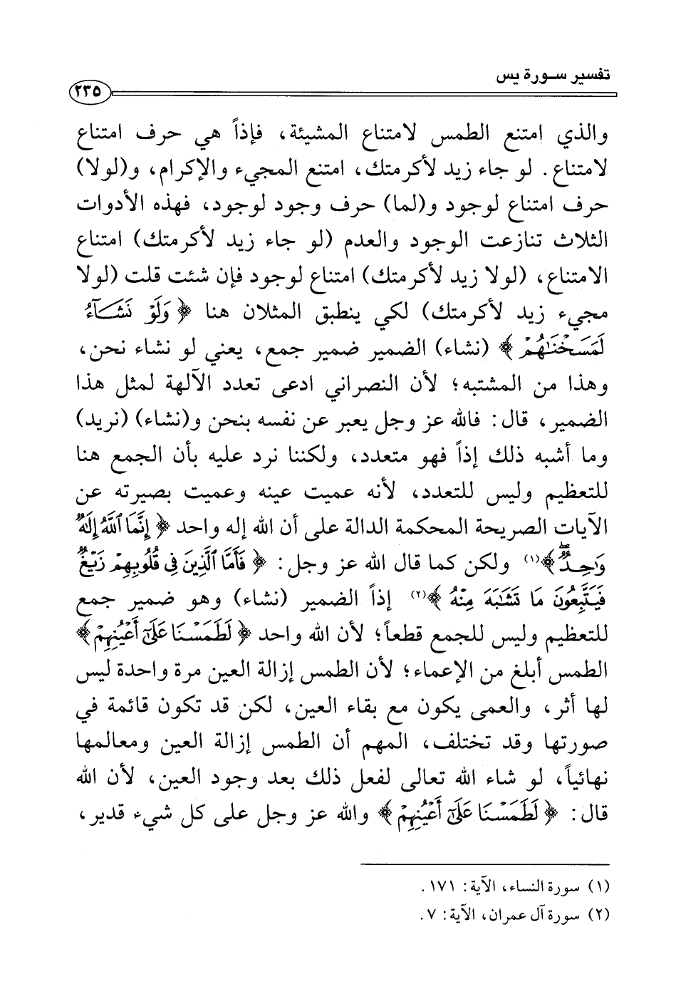 والذي امتنع الطمس لامتناع المشيئة، فإذًا هي حرف امتناع لامتناع. لو جاء زيد لأكرمتك، امتنع المجيء والإكرام، و (لولا) حرف امتناع لوجود و (لما) حرف وجود لوجود، فهذه الأدوات الثلاث تنازعت الوجود والعدم (لو جاء زيد لأكرمتك) امتناع الامتناع، (لولا زيد لأكرمتك) امتناع لوجود فإن شئت قلت (لولا مجيء زيد لأكرمتك) لكي ينطبق المثلان هنا {وَلَوْ نَشَاءُ لَمَسَخْنَاهُمْ} (نشاء) الضمير ضمير جمع، يعني لو نشاء نحن، وهذا من المشتبه؛ لأن النصراني ادعى تعدد الآلهة لمثل هذا الضمير، قال: فالله عز وجل يعبر عن نفسه بنحن و (نشاء) (نريد) وما أشبه ذلك إذًا فهو متعدد، ولكننا نرد عليه بأن الجمع هنا للتعظيم وليس للتعدد، لأنه عميت عينه وعميت بصيرته عن الآيات الصريحة المحكمة الدالة على أن الله إله واحد {إِنَّمَا اللَّهُ إِلَهٌ وَاحِدٌ} (¬١) ولكن كما قال الله عز وجل: {فَأَمَّا الَّذِينَ فِي قُلُوبِهِمْ زَيْغٌ فَيَتَّبِعُونَ مَا تَشَابَهَ مِنْهُ} (¬٢) إذًا الضمير (نشاء) وهو ضمير جمع للتعظيم وليس للجمع قطعًا، لأن الله واحد {لَطَمَسْنَا عَلَى أَعْيُنِهِمْ} الطمس أبلغ من الإعماء؛ لأن الطمس إزالة العين مرة واحدة ليس لها أثر، والعمى يكون مع بقاء العين، لكن قد تكون قائمة في صورتها وقد تختلف، المهم أن الطمس إزالة العين ومعالمها نهائيًا، لو شاء الله تعالى لفعل ذلك بعد وجود العين، لأن الله قال: {لَطَمَسْنَا عَلَى أَعْيُنِهِمْ} والله عز وجل على كل شيء قدير،