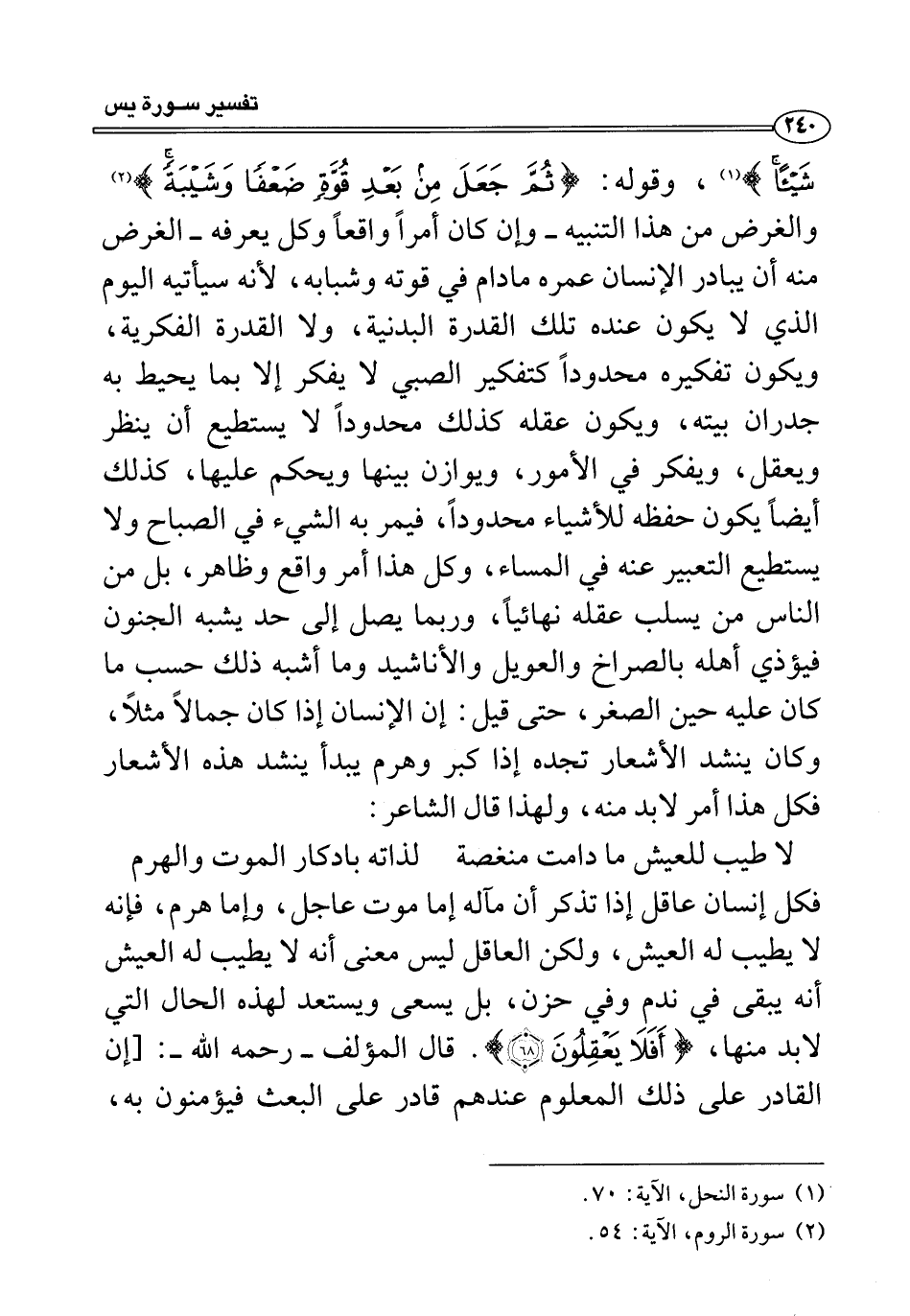 فكل إنسان عاقل إذا تذكر أن مآله إما موت عاجل، وإما هرم، فإنه لا يطيب له العيش، ولكن العاقل ليس معنى أنه لا يطيب له العيش أنه يبقى في ندم وفي حزن، بل يسعى ويستعد لهذه الحال التي لابد منها، {أَفَلَا يَعْقِلُونَ (٦٨)}. قال المؤلف -رحمه الله-: [إن القادر على ذلك المعلوم عندهم قادر على البعث فيؤمنون به،