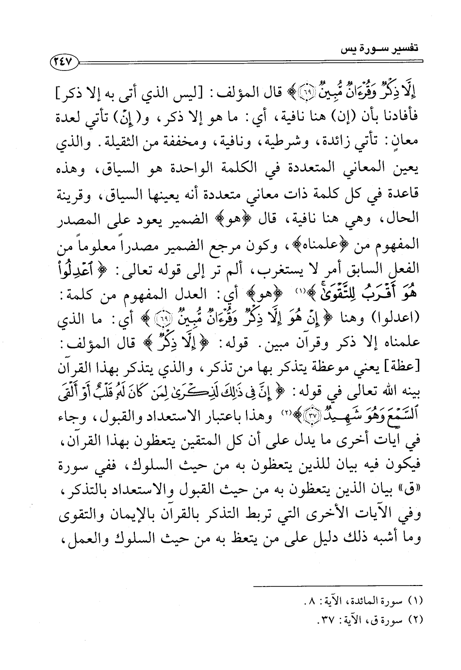 إِلَّا ذِكْرٌ وَقُرْآنٌ مُبِينٌ (٦٩)} قال المؤلف: [ليس الذي أتى به إلا ذكر] فأفادنا بأن (إن) هنا نافية، أي: ما هو إلا ذكر، و (إِن) تأتي لعدة معانٍ: تأتي زائدة، وشرطية، ونافية، ومخففة من الثقيلة. والذي يعين المعاني المتعددة في الكلمة الواحدة هو السياق، وهذه قاعدة في كل كلمة ذات معاني متعددة أنه يعينها السياق، وقرينة الحال، وهي هنا نافية، قال {هُوَ} الضمير يعود على المصدر المفهوم من {عَلَّمْنَاهُ}، وكون مرجع الضمير مصدرًا معلومًا من الفعل السابق أمر لا يستغرب، ألم تر إلى قوله تعالى: {اعْدِلُوا هُوَ أَقْرَبُ لِلتَّقْوَى} (¬١) {هُوَ} أي: العدل المفهوم من كلمة: (اعدلوا) وهنا {إِنْ هُوَ إِلَّا ذِكْرٌ وَقُرْآنٌ مُبِينٌ (٦٩)} أي: ما الذي علمناه إلا ذكر وقرآن مبين. قوله: {إِلَّا ذِكْرٌ} قال المؤلف: [عظة] يعني موعظة يتذكر بها من تذكر، والذي يتذكر بهذا القرآن بينه الله تعالى في قوله: {إِنَّ فِي ذَلِكَ لَذِكْرَى لِمَنْ كَانَ لَهُ قَلْبٌ أَوْ أَلْقَى السَّمْعَ وَهُوَ شَهِيدٌ (٣٧)} (¬٢) وهذا باعتبار الاستعداد والقبول، وجاء في آيات أخرى ما يدل على أن كل المتقين يتعظون بهذا القرآن، فيكون فيه بيان للذين يتعظون به من حيث السلوك، ففي سورة "ق" بيان الذين يتعظون به من حيث القبول والاستعداد بالتذكر، وفي الآيات الأخرى التي تربط التذكر بالقرآن بالإيمان والتقوى وما أشبه ذلك دليل على من يتعظ به من حيث السلوك والعمل،