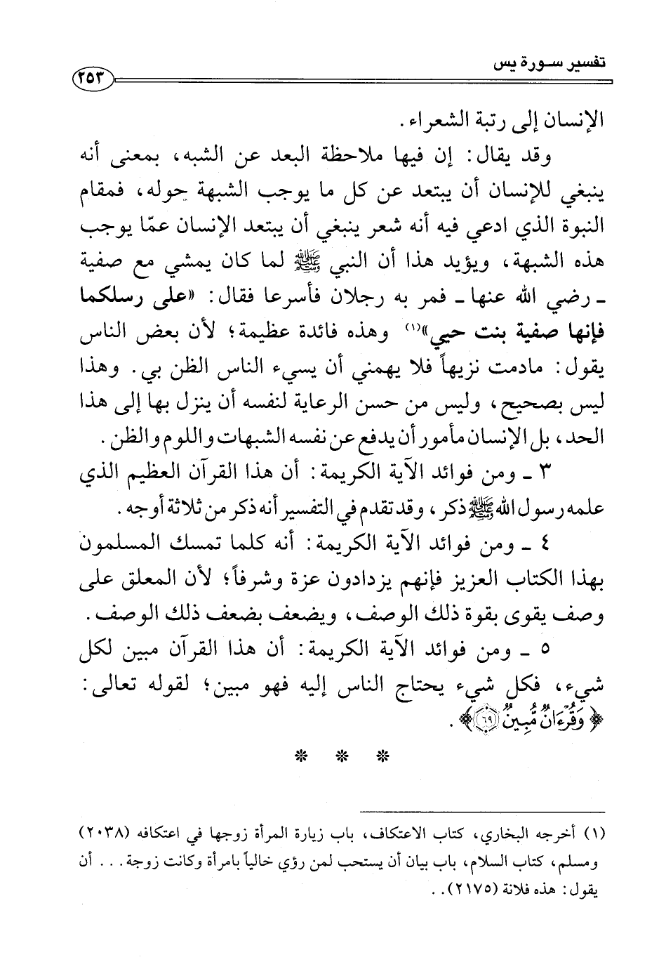 وقد يقال: إن فيها ملاحظة البعد عن الشبه، بمعنى أنه ينبغي للإنسان أن يبتعد عن كل ما يوجب الشبهة حوله، فمقام النبوة الذي ادعي فيه أنه شعر ينبغي أن يبتعد الإنسان عمّا يوجب هذه الشبهة، ويؤيد هذا أن النبي - صلى الله عليه وسلم - لما كان يمشي مع صفية - رضي الله عنها- فمر به رجلان فأسرعا فقال: "على رسلكما فإنها صفية بنت حيي" (¬١) وهذه فائدة عظيمة؛ لأن بعض الناس يقول: ما دمت نزيهًا فلا يهمني أن يسيء الناس الظن بي. وهذا ليس بصحيح، وليس من حسن الرعاية لنفسه أن ينزل بها إلى هذا الحد، بل الإنسان مأمور أن يدفع عن نفسه الشبهات واللوم والظن.