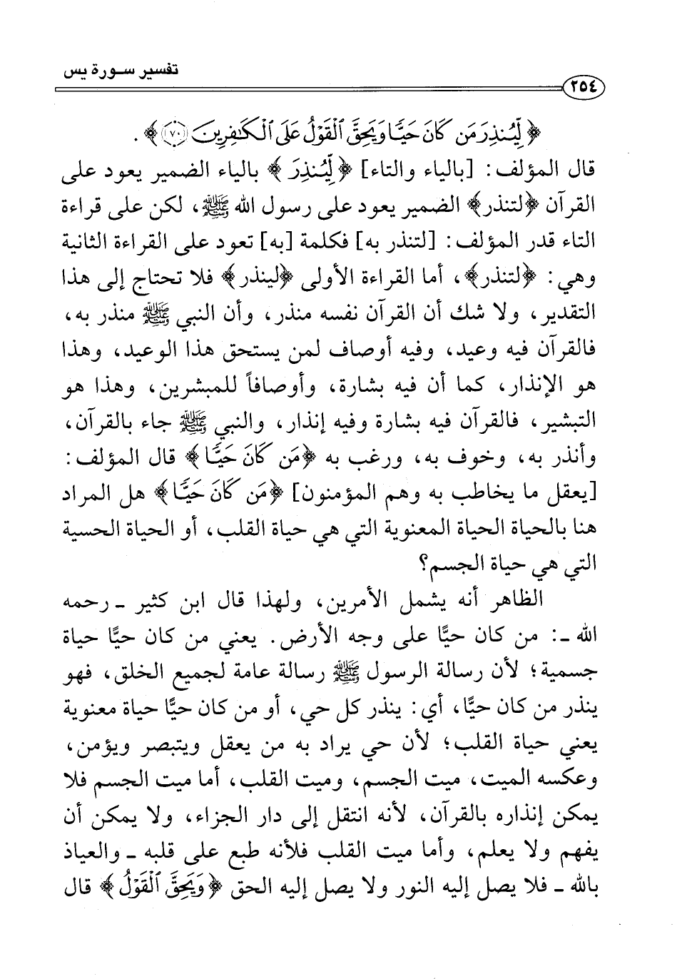 قال المؤلف: [بالياء والتاء] {لِيُنْذِرَ} بالياء الضمير يعود على القرآن {لتنذر} الضمير يعود على رسول الله - صلى الله عليه وسلم -، لكن على قراءة التاء قدر المؤلف: [لتنذر به] فكلمة [به] تعود على القراءة الثانية وهي: [لتنذر]، أما القراءة الأولى [لينذر] فلا تحتاج إلى هذا التقدير، ولا شك أن القرآن نفسه منذر، وأن النبي - صلى الله عليه وسلم - منذر به، فالقرآن فيه وعيد، وفيه أوصاف لمن يستحق هذا الوعيد، وهذا هو الإنذار، كما أن فيه بشارة، وأوصافًا للمبشرين، وهذا هو التبشير، فالقرآن فيه بشارة وفيه إنذار، والنبي - صلى الله عليه وسلم - جاء بالقرآن، وأنذر به، وخوف به، ورغب به {مَنْ كَانَ حَيًّا} قال المؤلف: [يعقل ما يخاطب به وهم المؤمنون] {مَنْ كَانَ حَيًّا} هل المراد هنا بالحياة الحياة المعنوية التي هي حياة القلب، أو الحياة الحسية التي هي حياة الجسم؟