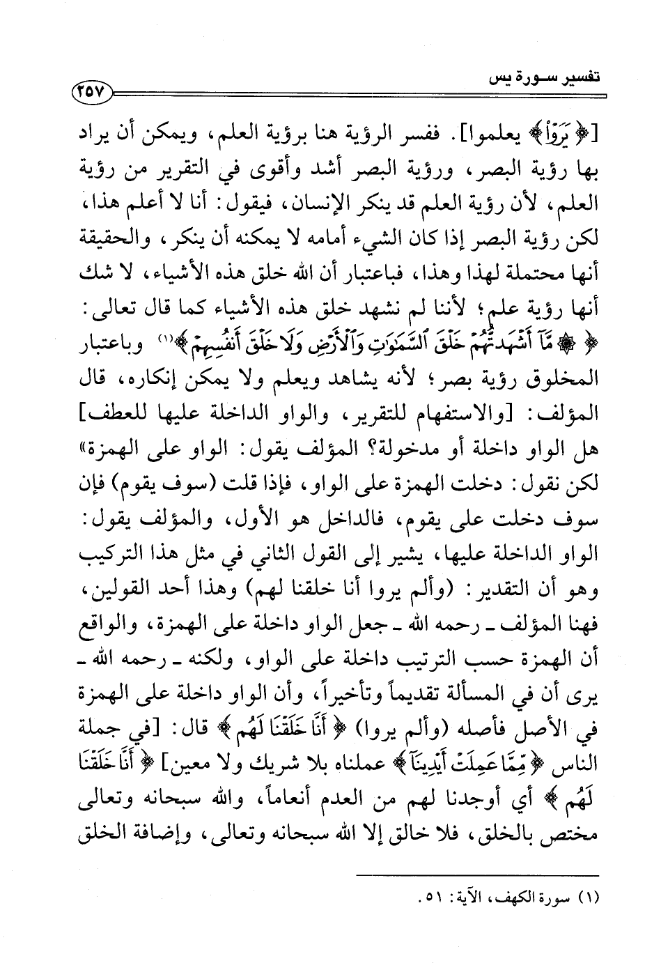 [{يَرَوْا} يعلموا]. ففسر الرؤية هنا برؤية العلم، ويمكن أن يراد بها رؤية البصر، ورؤية البصر أشد وأقوى في التقرير من رؤية العلم، لأن رؤية العلم قد ينكر الإنسان، فيقول: أنا لا أعلم هذا، لكن رؤية البصر إذا كان الشيء أمامه لا يمكنه أن ينكر، والحقيقة أنها محتملة لهذا وهذا، فباعتبار أن الله خلق هذه الأشياء، لا شك أنها رؤية علم؛ لأننا لم نشهد خلق هذه الأشياء كما قال تعالى: {مَا أَشْهَدْتُهُمْ خَلْقَ السَّمَاوَاتِ وَالْأَرْضِ وَلَا خَلْقَ أَنْفُسِهِمْ} (¬١) وباعتبار المخلوق رؤية بصر؛ لأنه يشاهد ويعلم ولا يمكن إنكاره، قال المؤلف: [والاستفهام للتقرير، والواو الداخلة عليها للعطف] هل الواو داخلة أو مدخولة؟ المؤلف يقول: الواو على الهمزة" لكن نقول: دخلت الهمزة على الواو، فإذا قلت (سوف يقوم) فإن سوف دخلت على يقوم، فالداخل هو الأول، والمؤلف يقول: الواو الداخلة عليها، يشير إلى القول الثاني في مثل هذا التركيب وهو أن التقدير: (وألم يروا أنا خلقنا لهم) وهذا أحد القولين، فهنا المؤلف - رحمه الله - جعل الواو داخلة على الهمزة، والواقع أن الهمزة حسب الترتيب داخلة على الواو، ولكنه - رحمه الله - يرى أن في المسألة تقديمًا وتأخيرًا، وأن الواو داخلة على الهمزة في الأصل فأصله (وألم يروا) {أَنَّا خَلَقْنَا لَهُمْ} قال: [في جملة الناس {مِمَّا عَمِلَتْ أَيْدِينَا} عملناه بلا شريك ولا معين] {أَنَّا خَلَقْنَا لَهُمْ} أي أوجدنا لهم من العدم أنعامًا، والله سبحانه وتعالى مختص بالخلق، فلا خالق إلا الله سبحانه وتعالى، وإضافة الخلق
