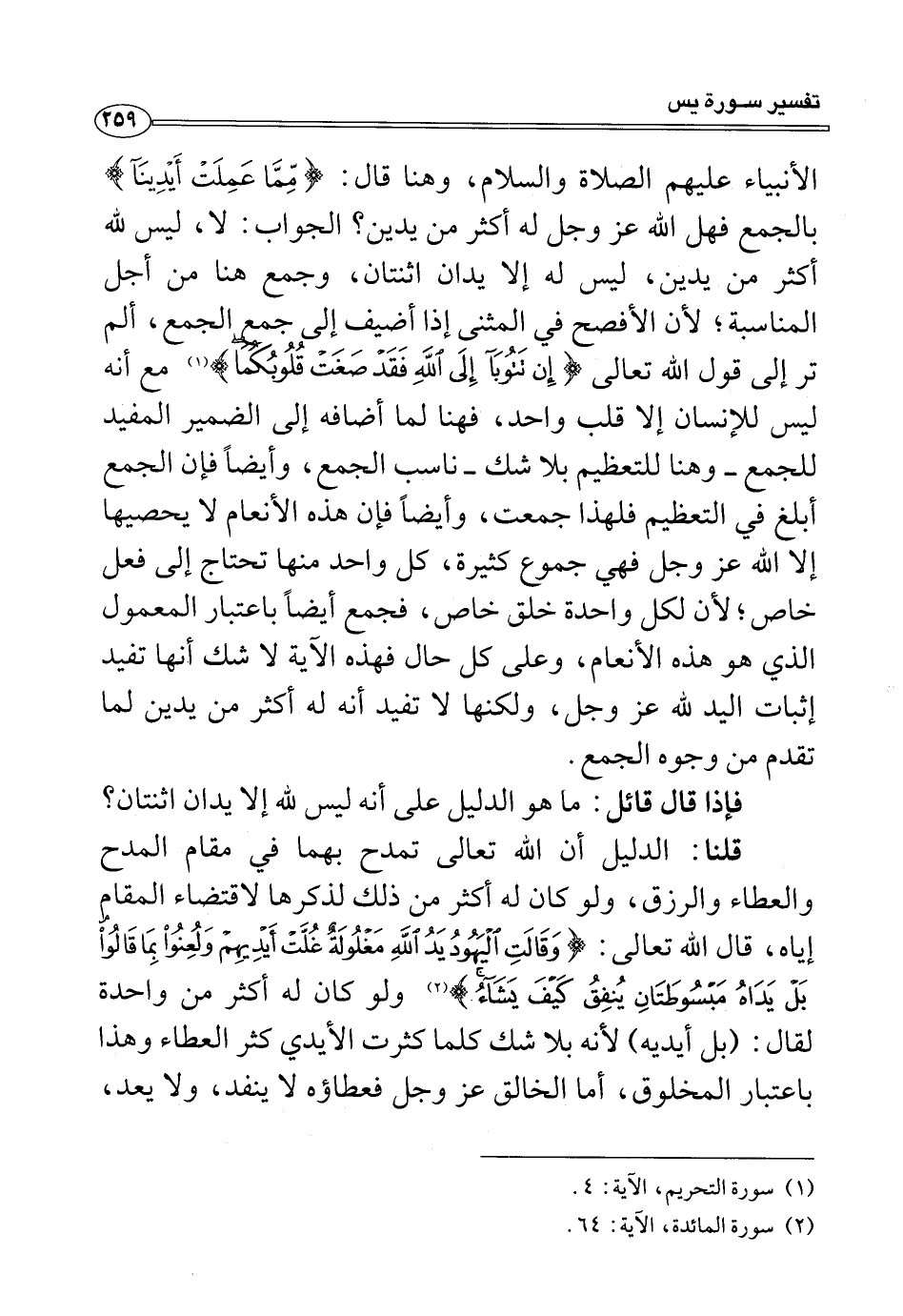 الأنبياء عليهم الصلاة والسلام، وهنا قال: {مِمَّا عَمِلَتْ أَيْدِينَا} بالجمع فهل الله عز وجل له أكثر من يدين؟ الجواب: لا، ليس لله أكثر من يدين، ليس له إلا يدان اثنتان، وجمع هنا من أجل المناسبة؛ لأن الأفصح في المثنى إذا أضيف إلى جمع الجمع، ألم تر إلى قول الله تعالى {إِنْ تَتُوبَا إِلَى اللَّهِ فَقَدْ صَغَتْ قُلُوبُكُمَا} (¬١) مع أنه ليس للإنسان إلا قلب واحد، فهنا لما أضافه إلى الضمير المفيد للجمع - وهنا للتعظيم بلا شك - ناسب الجمع، وأيضًا فإن الجمع أبلغ في التعظيم فلهذا جمعت، وأيضًا فإن هذه الأنعام لا يحصيها إلا الله عز وجل فهي جموع كثيرة، كل واحد منها تحتاج إلى فعل خاص؛ لأن لكل واحدة خلق خاص، فجمع أيضًا باعتبار المعمول الذي هو هذه الأنعام، وعلى كل حال فهذه الآية لا شك إنها تفيد إثبات اليد لله عز وجل، ولكنها لا تفيد أنه له أكثر من يدين لما تقدم من وجوه الجمع.