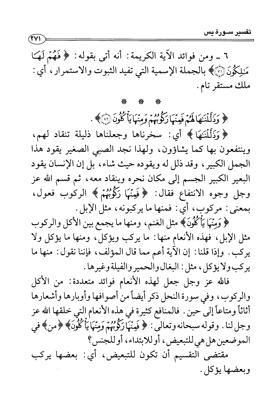 فالله عز وجل جعل لهذه الأنعام فوائد متعددة: من الأكل والركوب، وفي سورة النحل ذكر أيضًا من أصوافها وأوبارها وأشعارها أثاثًا ومتاعًا إلى حين. فالمنافع كثيرة في هذه الأنعام التي خلقها الله عز وجل لنا. وقوله سبحانه وتعالى: {فَمِنْهَا رَكُوبُهُمْ وَمِنْهَا يَأْكُلُونَ} {من} في الموضعين هل هي للتبعيض، أو للابتداء، أو للجنس؟