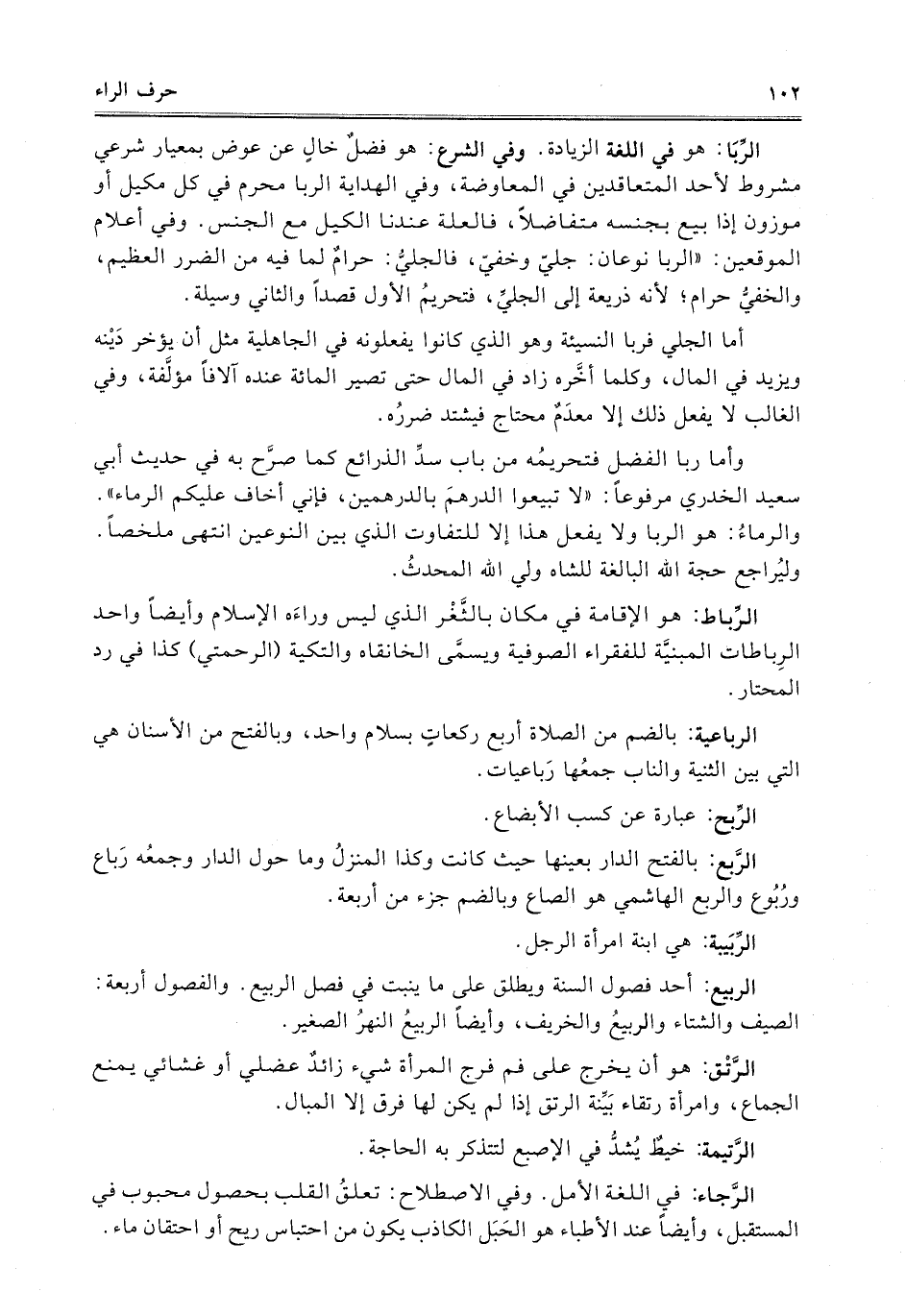 الرِّبَا: هو في اللغة الزيادة. وفي الشرع: هو فضلٌ خالٍ عن عوض بمعيار شرعي مشروط لأحد المتعاقدين في المعاوضة، وفي الهداية الربا محرم في كل مكيل أو موزون إذا بيع بجنسه متفاضلاً، فالعلة عندنا الكيل مع الجنس. وفي أعلام الموقعين: "الربا نوعان: جليّ وخفيّ، فالجليُّ: حرامٌ لما فيه من الضرر العظيم، والخفيُّ حرام، لأنه ذريعة إلى الجليِّ، فتحريمُ الأول قصداً والثاني وسيلة.