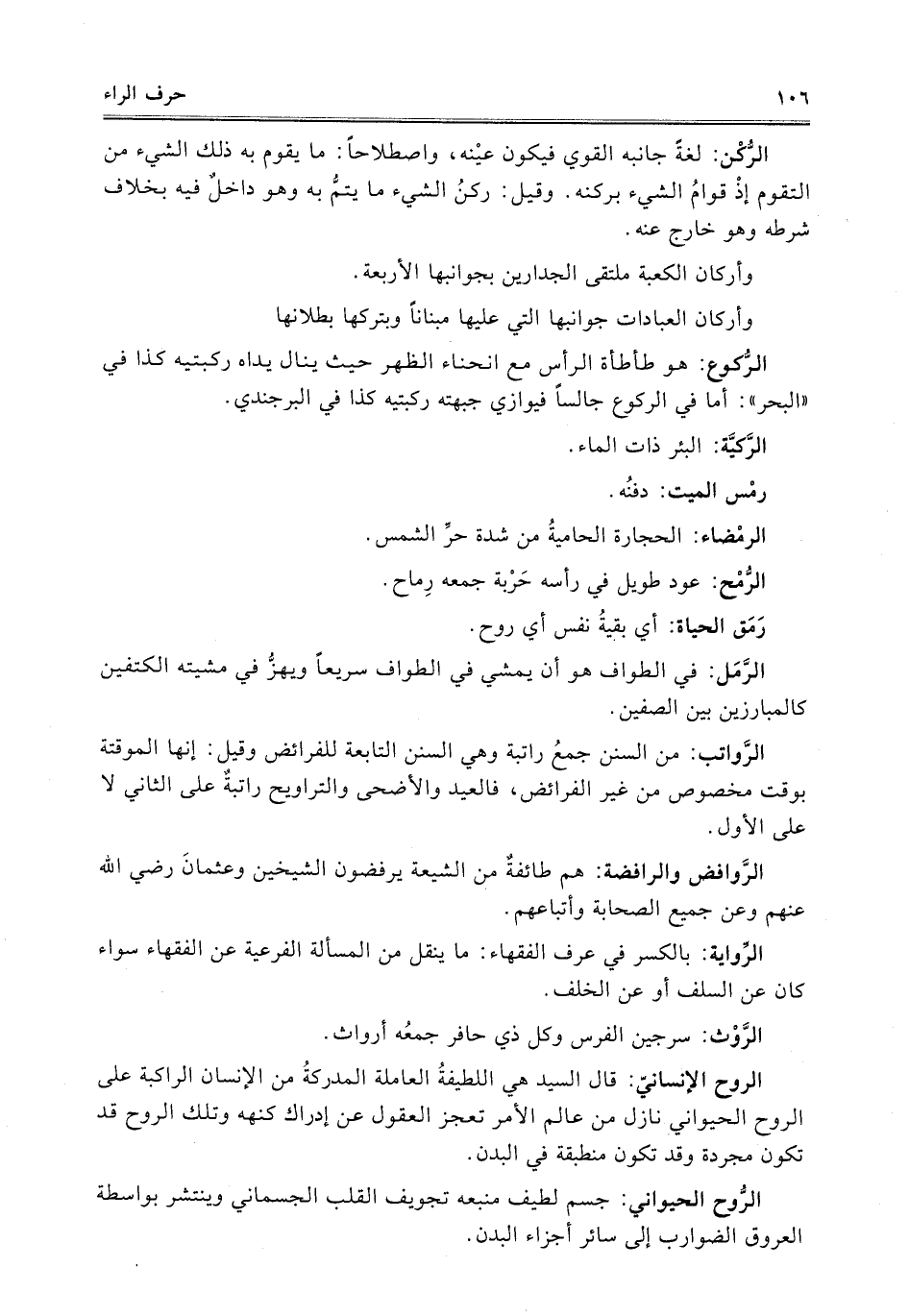 الرُّكْن: لغةً جانبه القوي فيكون عيْنه، واصطلاحاً: ما يقوم به ذلك الشيء التقوم إذْ قوامُ الشيء بركنه. وقيل: ركنُ الشيء ما يتمُّ به وهو داخلٌ فيه بخلاف شرطه وهو خارج عنه.