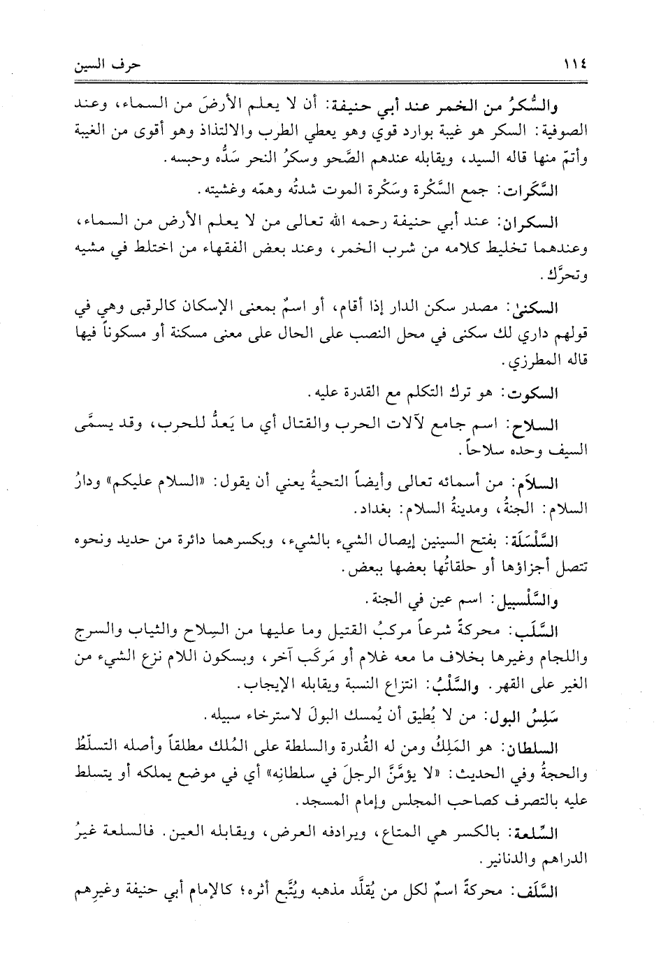 والسُّكرُ من الخمر عند أبي حنيفة: أن لا يعلم الأرضَ من السماء، وعند الصوفية: السكر هو غيبة بوارد قوي وهو يعطي الطرب والالتذاذ وهو أقوى من الغيبة وأتمّ منها قاله السيد، ويقابله عندهم الصَّحو وسكرُ النحر سَدُّه وحبسه.