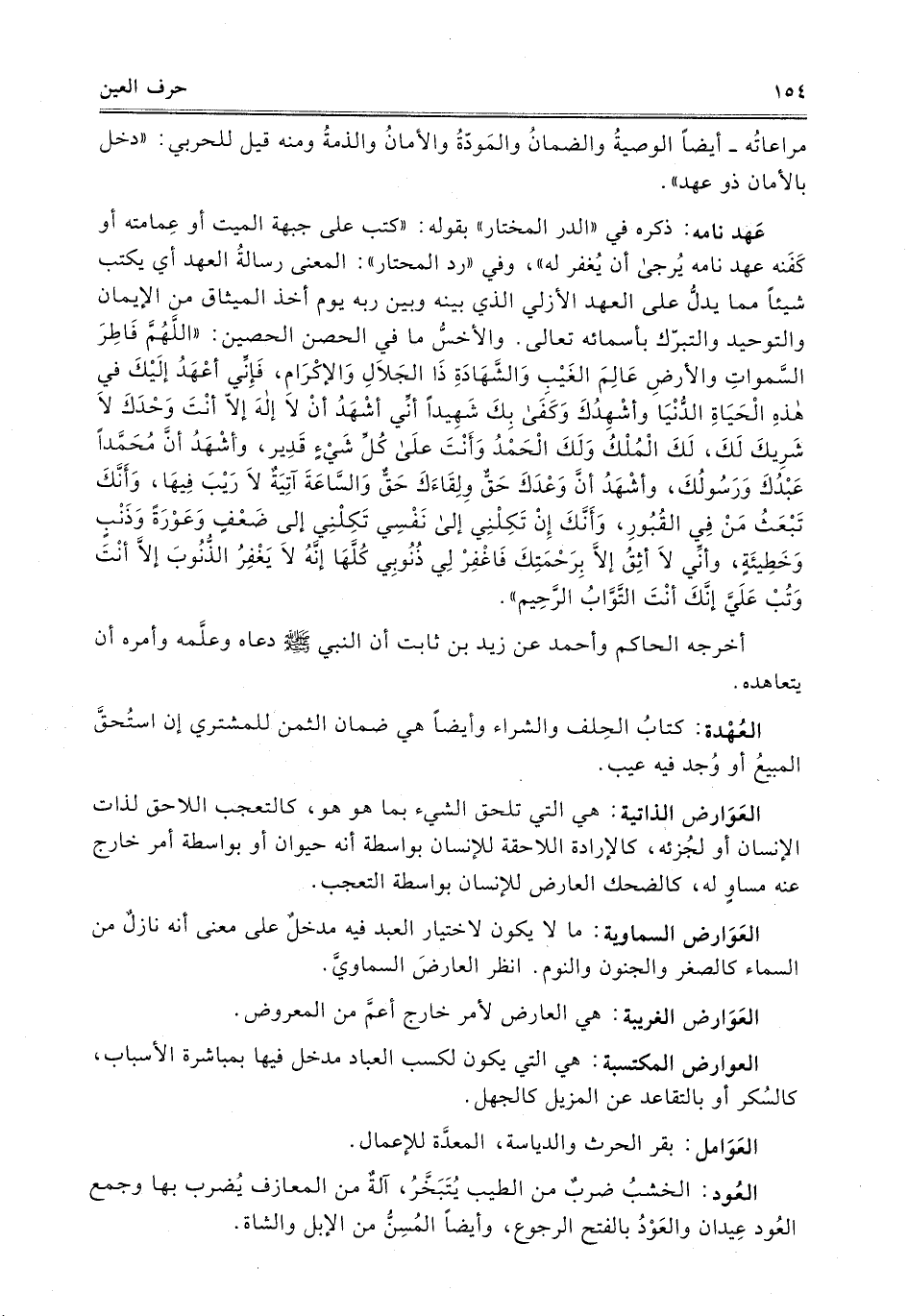 مراعاتُه -أيضاً الوصيةُ والضمانُ والمَودّةُ والأمانَ والذمةُ ومنه قيل للحربي: "دخل بالأمان ذو عهد".