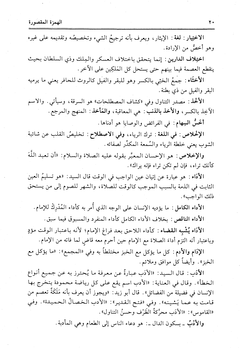 الأدَب: قال السيد: "الأدَب عبارةٌ عن معرفة ما يحترز به عن جميع أنواع الخطأ". وقال في العناية: "الأدب اسم يقع على كل رياضة محمودة يتخرج بها الإنسان في فضيلة من الفضائل". قال أبو زيد: "ويجوز أن يعرف بأنه مَلَكَةٌ تعصم من قامت به عما يَشينه". وفي "فتح القدير": "الأدب الخصالُ الحميدة". وفي "القاموس": "الأدَب محرَّكةً الظَرْف وحسنُ التناول".