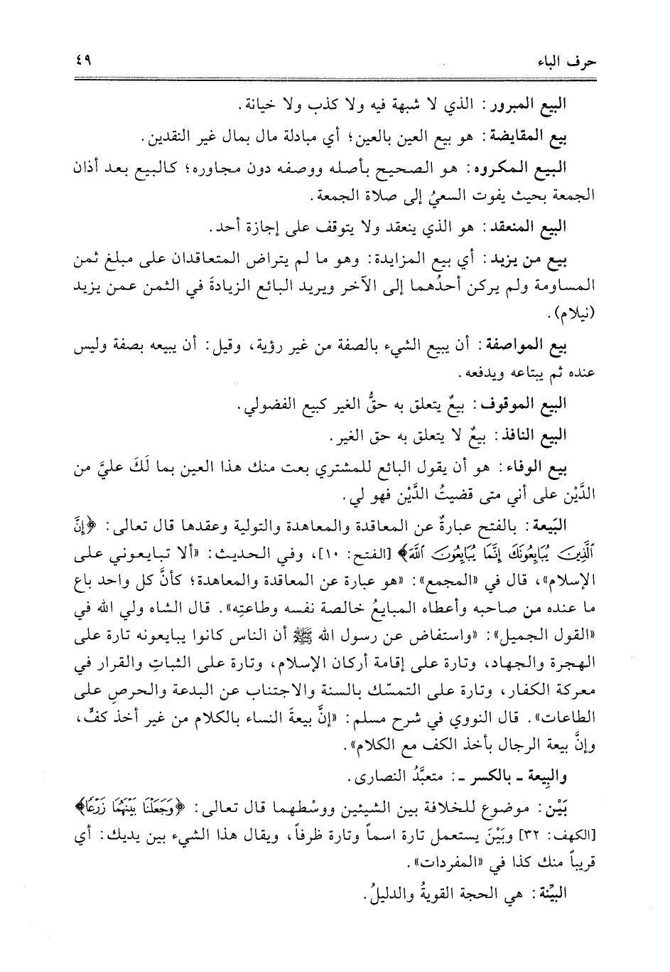 البَيعة: بالفتح عبارةٌ عن المعاقدة والمعاهدة والتولية وعقدها قال تعالى: {إِنَّ الَّذِينَ يُبَايِعُونَكَ إِنَّمَا يُبَايِعُونَ اللَّهَ} [الفتح:10]، وفي الحديث: "ألا تبايعوني على الإسلام"، قال في "المجتمع": "هو عبارة عن المعاقدة والمعاهدة، كأنَّ كل واحد باع ما عنده من صاحبه وأعطاه المبايعُ خالصة نفسه وطاعتِه". قال الشاه ولي الله في "القول الجميل": "واستفاض عن رسول الله - صلى الله عليه وسلم - أن الناس كانوا يبايعونه تارة على الهجرة والجهاد، وتارة على إقامة أركان الإسلام، وتارة على الثباتِ والقرار في معركة الكفار، وتارة على التمسّك بالسنة والاجتناب عن البدعة والحرصِ على الطاعات". قال النووي في شرح مسلم: "إنَّ بيعةَ النساء بالكلام من غير أخذ كفٍّ، وإنَّ بيعة الرجال بأخذ الكف مع الكلام".