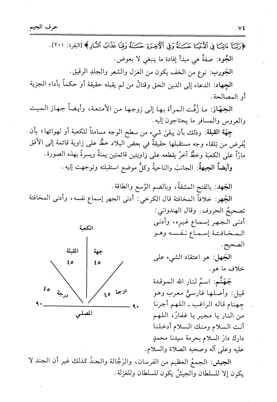 جِهَة القبلة: وذلك بأن يبقى شيء من سطح الوجه مسامتاً للكعبة أو لهوائها، بأن يُفرض من تِلقاء وجه مستقبلها حقيقةً في بعض البلاد خطٌّ على زاوية قائمة إلى الأفق مارّاً على الكعبة وخطٌّ آخرُ يقطعه على زاويتين قائمتين يمنةً ويسرةً بهذه الصورة.