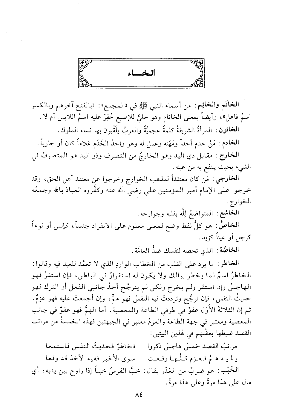 الخاطر: ما يرد على القلب من الخطاب الواردِ الذي لا تعمَّد للعبد فيه وقالوا: الخاطرُ اسمٌ لما يخطر ببالك ولا يكون له استقرارٌ في الباطن، فإن استقرَّ فهو الهاجسُ وإن استقر ولم يخرج ولكن لم يترجَّح أحدُ جانبي الفعل أو الترك فهو حديثُ النفس، فإن ترجَّح وترددتْ فيه النفسُ فهو همٌّ، وإن أجمعتَ عليه فهو عزمٌ. ثم إن الثلاثةَ الأُوَل عفوٌ في طرفي الطاعة والمعصية، أما الهمُّ فهو عفوٌ في جانب المعصية ومعتبر في جهة الطاعة والعزمُ معتبر في الجبهتين فهذه الخمسةُ من مراتب القصد ضبطها بعضُهم في هذين البيتين: