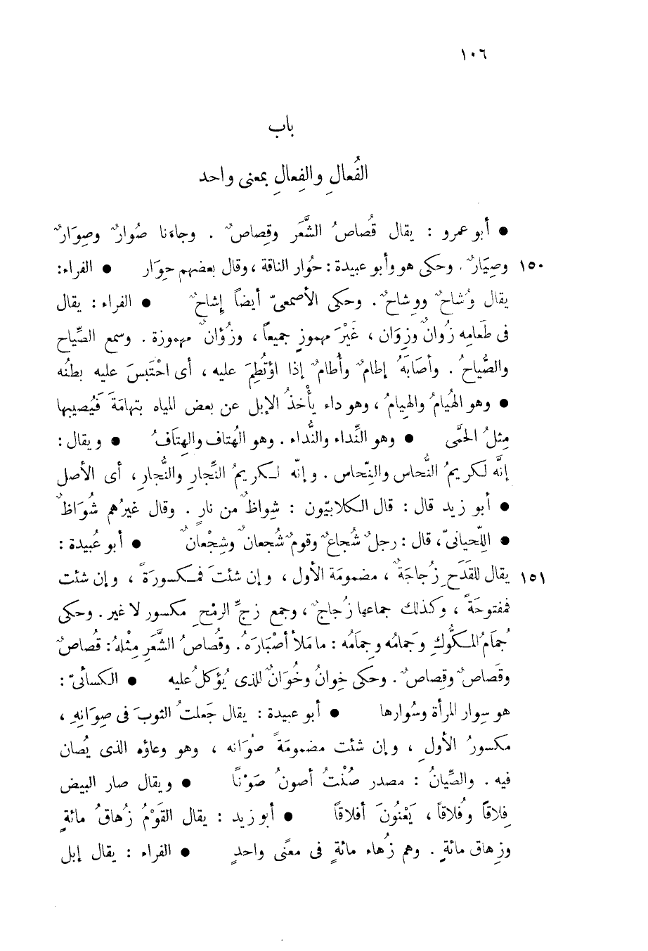 أبو عمرو يقال قصاص الشعر وقصاص وجاءنا صوار وصوار وصيار وحكى هو وأبو عبيدة حوار الناقة وقال بعضهم حوار الفراء يقال وشاح ووشاح وحكى الأصمعي أيضا إشاح الفراء يقال في طعامه زوان وزؤان غير مهموز جميعا وزوان مهموزة وسمع الصياح والصياح وأصابه إطام وأطام إذا اؤتطم عليه أي احتبس عليه بطنه وهو الهيام والهيام وهو داء يأخذ الإبل عن بعض المياه بتهامة فيصيبها مثل الحمى وهو النداء والنداء وهو الهتاف والهتاف