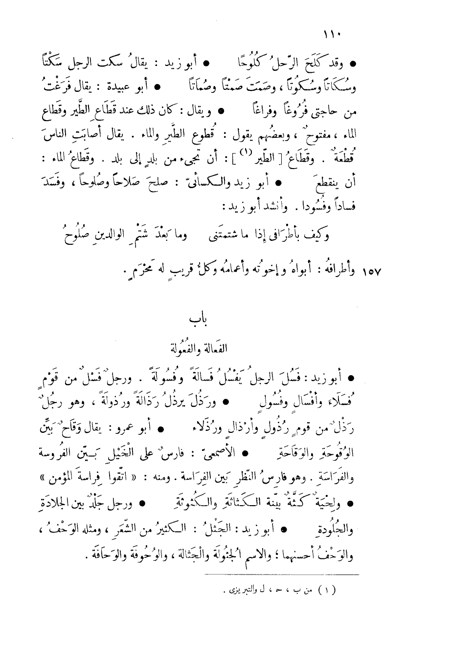 أبو زيد فسل الرجل يفسل فسالة وفسولة ورجل فسل من قوم فسلاء وأفسال وفسول ورذل يرذل رذالة ورذولة وهو رجل رذل من قوم رذول وأرذال ورذلاء أبو عمرو يقال وقاح بين الوقوحة والوقاحة الأصمعي فارس على الخيل بين الفروسة والفراسة وهو فارس النظر بين الفراسة ومنه اتقوا فراسة المؤمن ولحية كثة بينة الكثاثة والكثوثة ورجل جلد بين الجلادة والجلودة أبو زيد الجثل الكثير من الشعر ومثله الوحف والوحف أحسنهما والاسم الجثولة والجثالة والوحوفة والوحافة