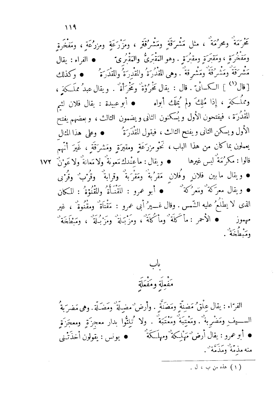 ويقال عبد مملكة ومملكة إذا ملك ولم يملك أبواه أبو عبيدة يقال فلان لئيم المقدرة فيفتحون الأول ويسكنون الثاني ويضمون الثالث وبعضهم يفتح الأول ويسكن الثاني ويفتح الثالث فيقول المقدرة وعلى هذا المثال يعملون بما كان من هذا الباب نحو مزرعة ومقبرة ومشرقة غير أنهم قالوا مكرمة ليس غيرها
