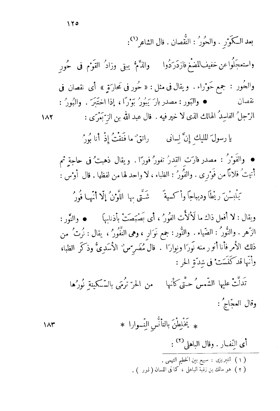 ويقال لا أفعل ذاك ما لألأت الفور أي بصبصت بأذنابها والنور الزهر والنور الضياء والنور جمع نوار وهي النفور يقال نرت من ذلك الأمر فأنا أنور منه نورا ونوارا قال مضرس الأسدي وذكر الظباء وأنها قد كنست في شدة الحر