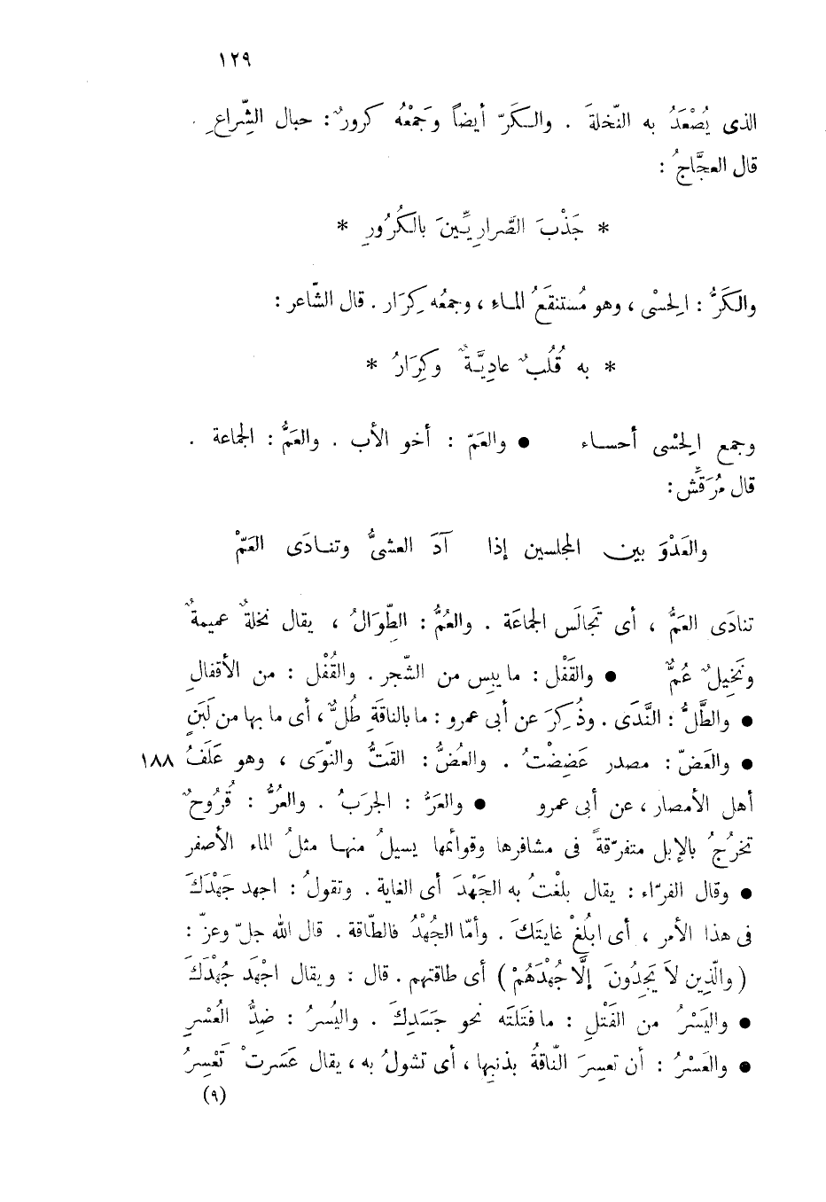 تنادى العم أي تجالس الجماعة والعم الطوال يقال نخلة عميمة ونخيل عم والقفل ما يبس من الشجر والقفل من الأقفال والطل الندى وذكر عن أبي عمرو ما بالناقة طل أي ما بها من لبن والعض مصدر عضضت والعض القت والنوى وهو علف أهل الأمصار عن أبي عمرو والعر الجرب والعر قروح تخرج بالإبل متفرقة في مشافرها وقوائمها يسيل منها مثل الماء الأصفر وقال الفراء يقال بلغت به الجهد أي الغاية وتقول اجهد جهدك في هذا الأمر أي ابلغ غايتك وأما الجهد فالطاقة قال الله جل وعز ( والذين لا يجدون إلا جهدهم ) أي طاقتهم قال