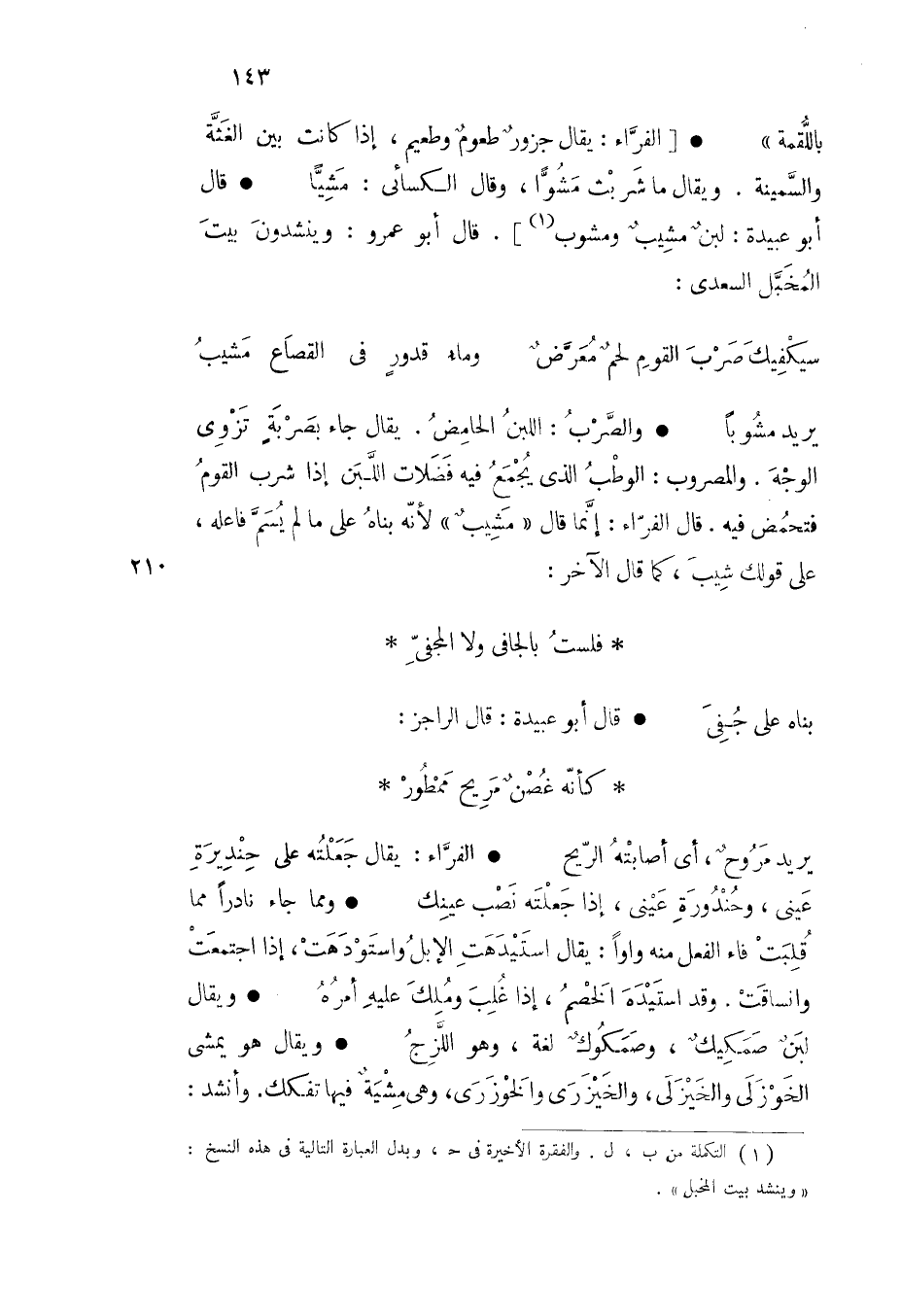 ويقال ما شربت مشوا وقال الكسائي مشيا قال أبو عبيدة لبن مشيب ومشوب قال أبو عمرو وينشدون بيت المخبل السعدي