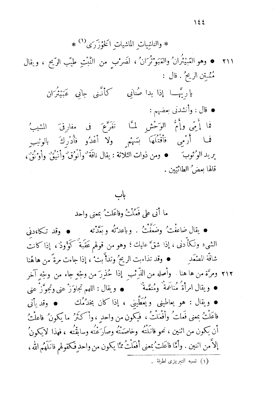 يريد الوثوب ومن ذوات الثلاثة يقال ناقة وأنوق وأنيق وأونق قالها بعض الطائيين باب ما أتى على فعلت وفاعلت بمعنى واحد