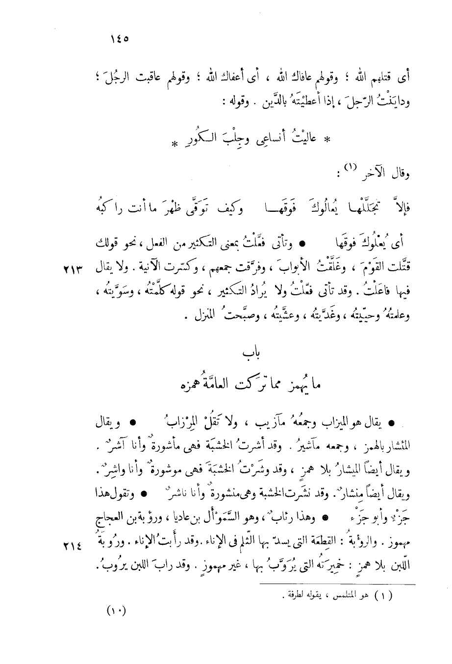 ويقال أيضا منشار وقد نشرت الخشبة وهي منشورة وأنا ناشر وتقول هذا جزء وأبو جزء وهذا رئاب وهو السموأل بن عاديا ورؤبة عن العجاج مهموز والرؤبة القطعة التي يسد بها الثلم في الإناء وقد رأبت الإناء وروبة اللبن بلا همز خميرته التي يروب بها غير مهموز وقد