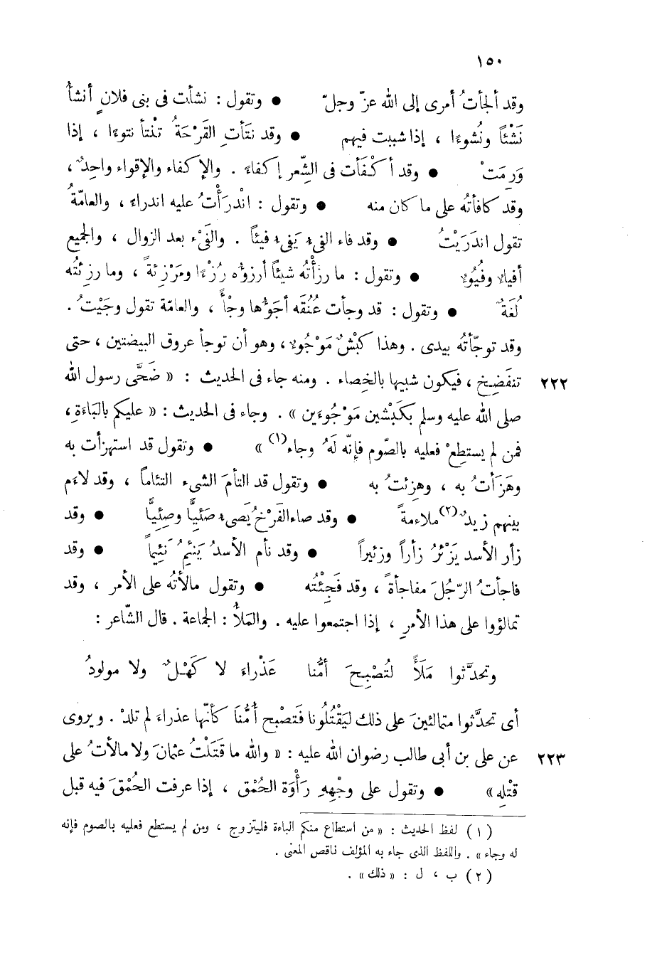 وقد ألجأت أمري إلى الله عز وجل وتقول نشأت في بني فلان أنشأ نشأ ونشوءا إذا شببت فيهم وقد نتأت القرحة تنتأ نتوءا إذا ورمت وقد أكفأت في الشعر إكفاء والإكفاء والإقواء واحد وقد كافأته على ما كان منه وتقول اندرأت عليه اندراء والعامة تقول اندريت وقد فاء الفيء يفيء فيئا والفيء بعد الزوال والجميع أفياء وفيوء وتقول ما رزأته شيئا أرزؤه ومرزئة وما رزئته لغة وتقول قد وجأت عنقه أجؤها وجا والعامة تقول وجيت وقد توجأته بيدي وهذا كبش موجوء وهو أن توجأ عروق البيضتين حتى تنفضخ فيكون شبيها بالخصاء ومنه جاء في الحديث ضحى رسول الله بكبشين موجوءين وجاء في الحديث عليكم بالباءة فمن لم يستطع فعليه بالصوم فإنه له وجاء وتقول قد استهزأت به وهزأت به وهزئت به وتقول قد التأم الشيء التآما وقد لاءم بينهم زيد ملاءمة وقد صاء الفرخ يصيء صئيا وصيئا وقد زأر الأسد يزئر زأرا وزئيرا وقد نأم الأسد ينئم نئيما وقد فاجأت الرجل مفاجأة وقد فجئته وتقول مالأته على الأمر وقد تمالؤوا على هذا الأمر إذا اجتمعوا عليه والملأ الجماعة قال الشاعر