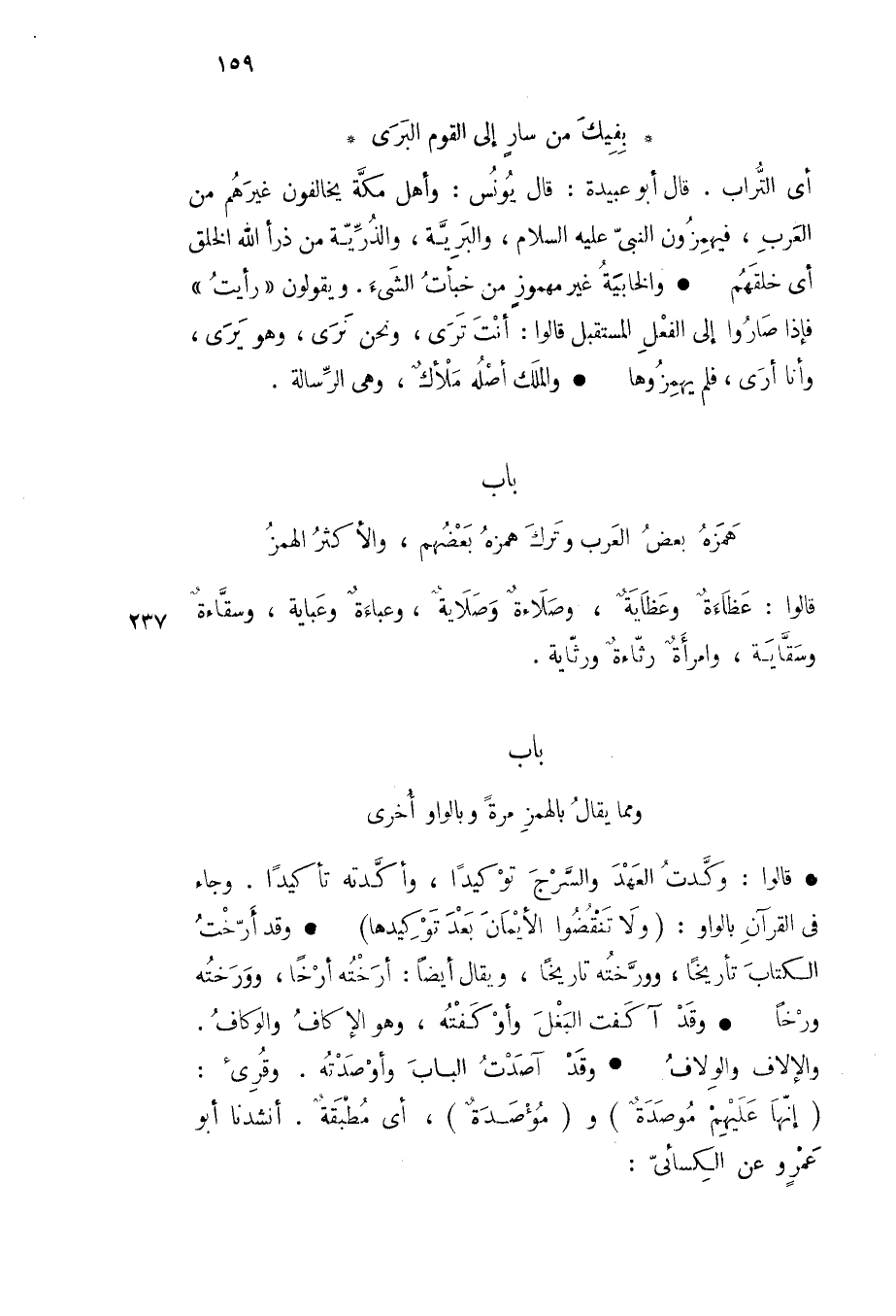 أي التراب قال أبو عبيدة قال يونس وأهل مكة يخالفون غيرهم من العرب فيهمزون النبي عليه السلام والبرية والذرية من ذرأ الله الخلق أي خلقهم والخابية غير مهموز من خبأت الشيء ويقولون رأيت فإذا صاروا إلى الفعل المستقبل قالوا أنت ترى ونحن نرى وهو يرى وأنا أرى فلم يهمزوها والملك أصله ملأك وهي الرسالة باب همزه بعض العرب وترك همزه بعضهم والأكثر الهمز