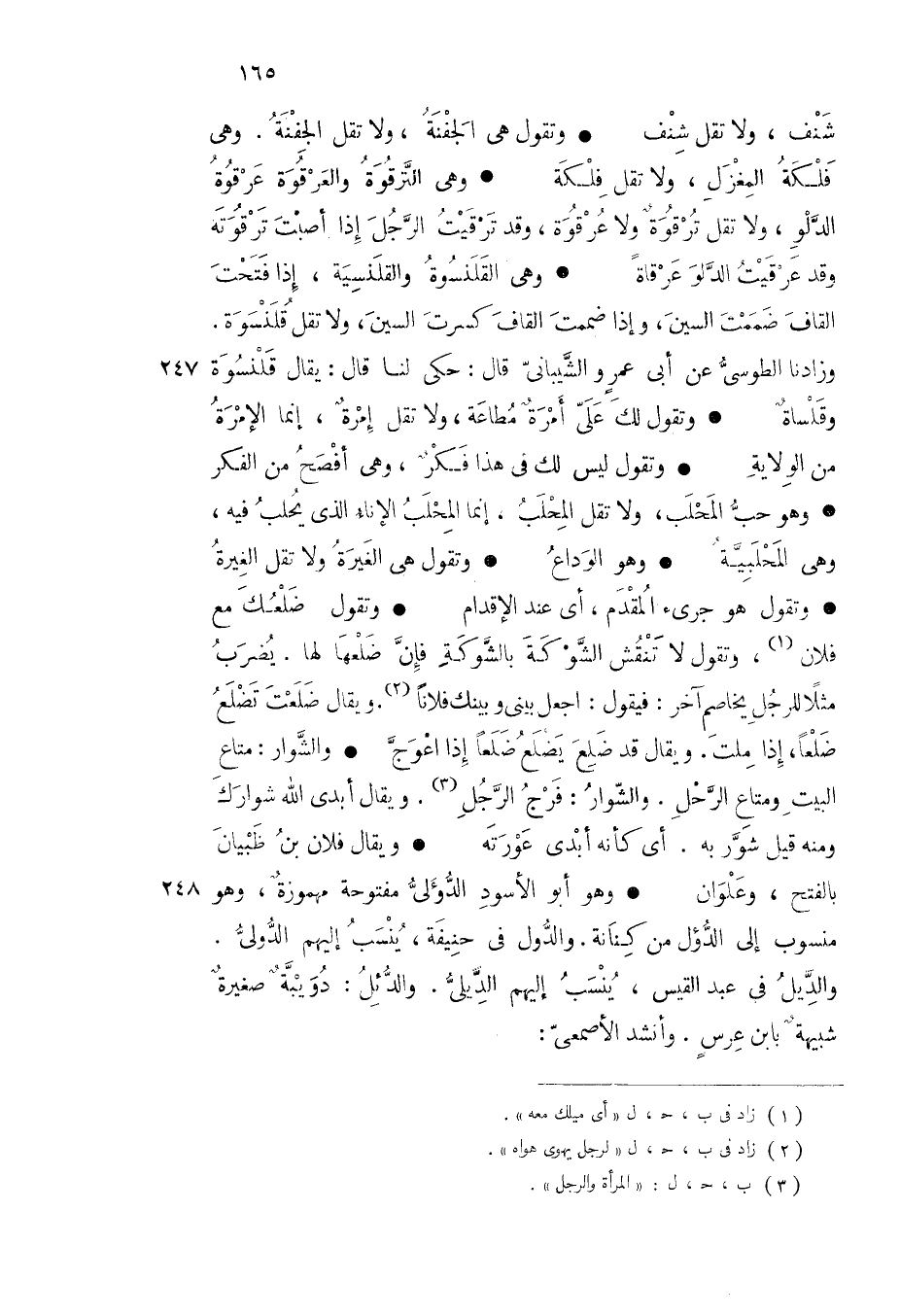 شنف ولا تقل شنف وتقول هي الجفنة ولا تقل الجفنة وهي فلكة المغزل ولا تقل فلكة وهي الترقوة والعرقوة عرقوة الدلو ولا تقل ترقوة ولا عرقوة وقد ترقيت الرجل إذا أصبت ترقوته وقد عرقيت الدلو عرقاة وهي القلنسوة والقلنسية إذا فتحت القاف ضممت السين وإذا ضممت القاف كسرت السين ولا تقل قلنسوة وزادنا الطوسي عن أبي عمرو الشيباني قال حكى لنا قال يقال قلنسوة وقلساة وتقول لك على أمرة مطاعة ولا تقل إمرة إنما الإمرة من الولاية وتقول ليس لك في هذا فكر وهي أفصح من الفكر وهو حب المحلب ولا تقل المحلب إنما المحلب الإناء الذي يحلب فيه وهي المحلبية وهو الوداع وتقول هي الغيرة ولا تقل الغيرة وتقول هو جريء المقدم أي عند الإقدام وتقول ضلعك مع فلان وتقول لا تنقش الشوكة بالشوكة فإن ضلعها لها يضرب مثلا للرجل يخاصم آخر فيقول اجعل بيني وبينك فلانا