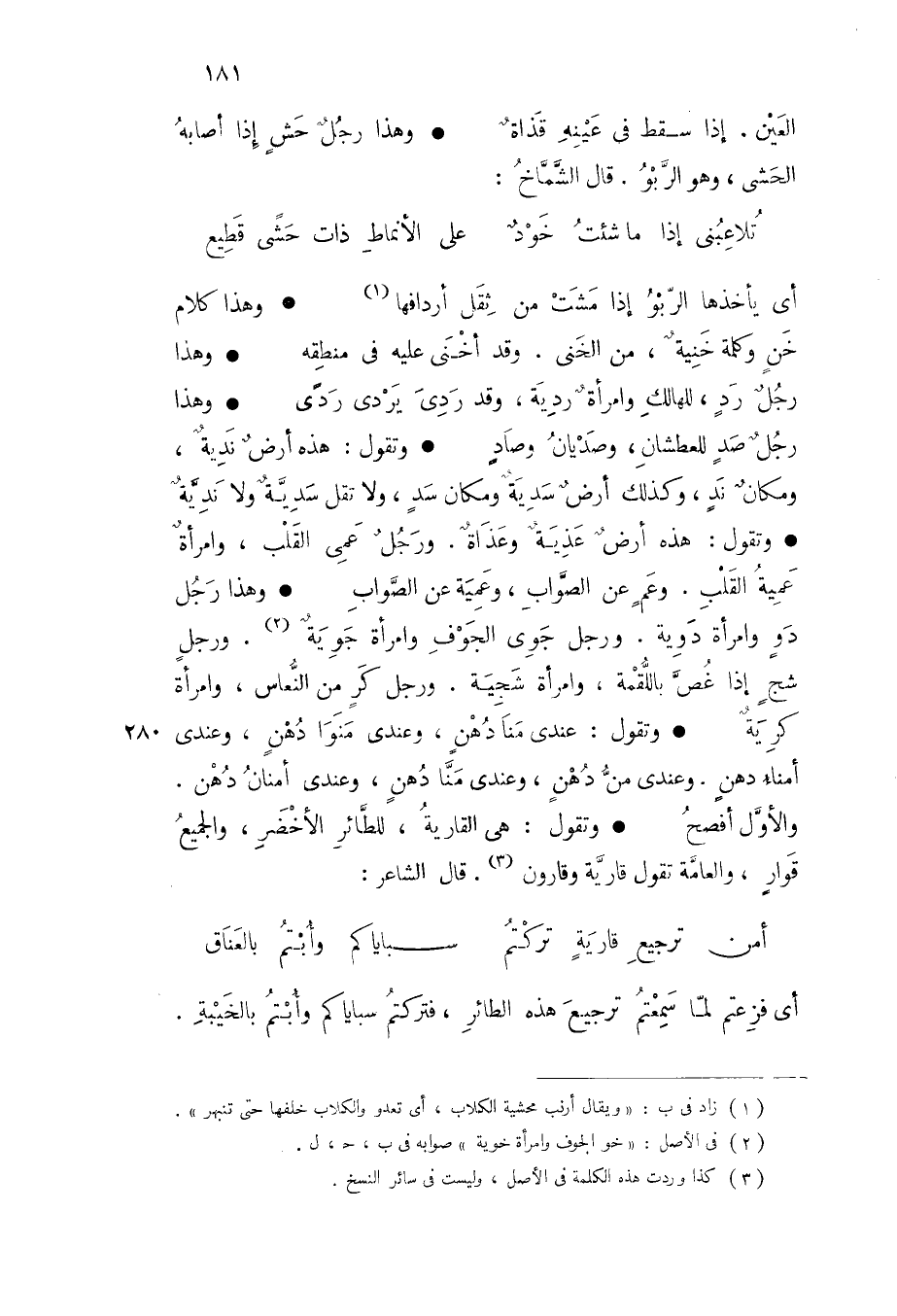 أي يأخذها الربو إذا مشت من ثقل أردافها وهذا كلام خن وكلمة خنية من الخنى وقد أخنى عليه في منطقه وهذا رجل رد للهالك وامرأة ردية وقد ردى يردى ردى وهذا رجل صد للعطشان وصديان وصاد وتقول هذه أرض ندية ومكان ند وكذلك أرض سدية ومكان سد ولا تقل سدية ولا ندية وتقول هذه أرض عذية وعذاة ورجل عمى القلب وامرأة عمية القلب وعم عن الصواب وعمية عن الصواب وهذا رجل دو وامرأة دوية ورجل جوى الجوف وامرأة جوية ورجل شج إذا غص باللقمة وامرأة شجية ورجل كر من النعاس وامرأة كرية وتقول عندي منا دهن وعندي منوا دهن وعندي أمناء دهن وعندي من دهن وعندي منا دهن وعندي أمنان دهن والأول أفصح وتقول هي القارية للطائر الأخضر والجميع قوار والعامة تقول قارية وقارون قال الشاعر
