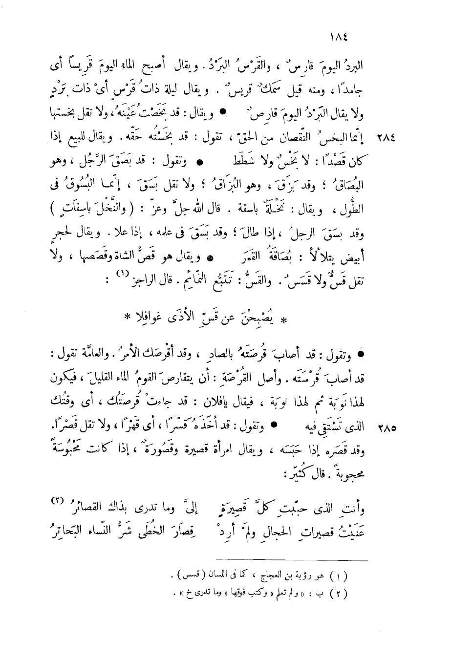 ويقال هو قص الشاة وقصصها ولا تقل قس ولا قسس والقس تتبع النمائم قال الراجز