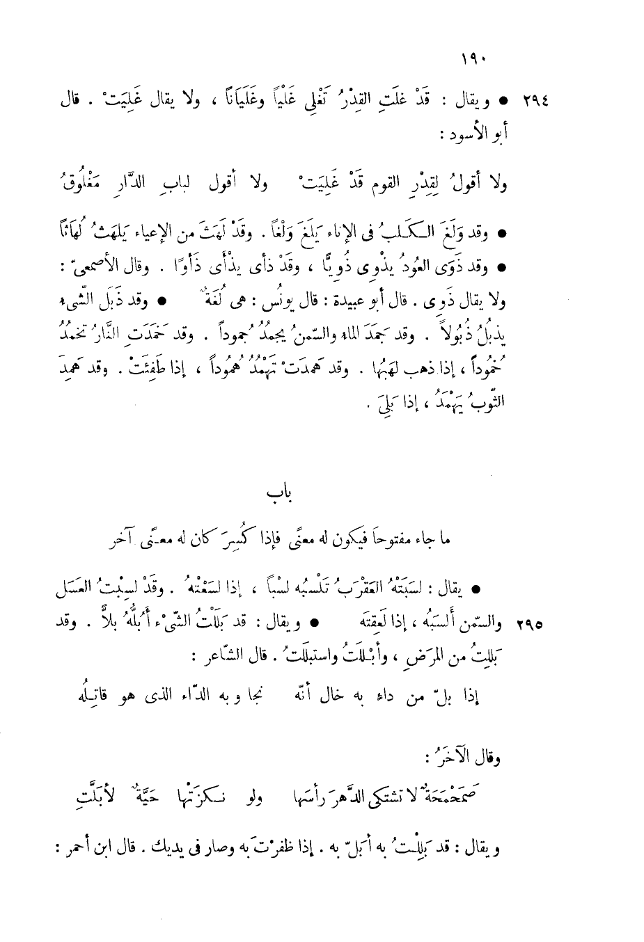وقد ذوى العود يذوي ذويا وقد ذأى يذأى ذأوا وقال الأصمعي ولا يقال ذوى قال أبو عبيدة قال يونس هي لغة وقد ذبل الشيء يذبل ذبولا وقد جمد الماء والسمن يجمد جمودا وقد خمدت النار تخمد خمودا إذا ذهب لهبها وقد همدت تهمد همودا إذا طفئت وقد همد الثوب يهمد إذا بلى باب ما جاء مفتوحا فيكون له معنى فإذا كسر كان له معنى آخر