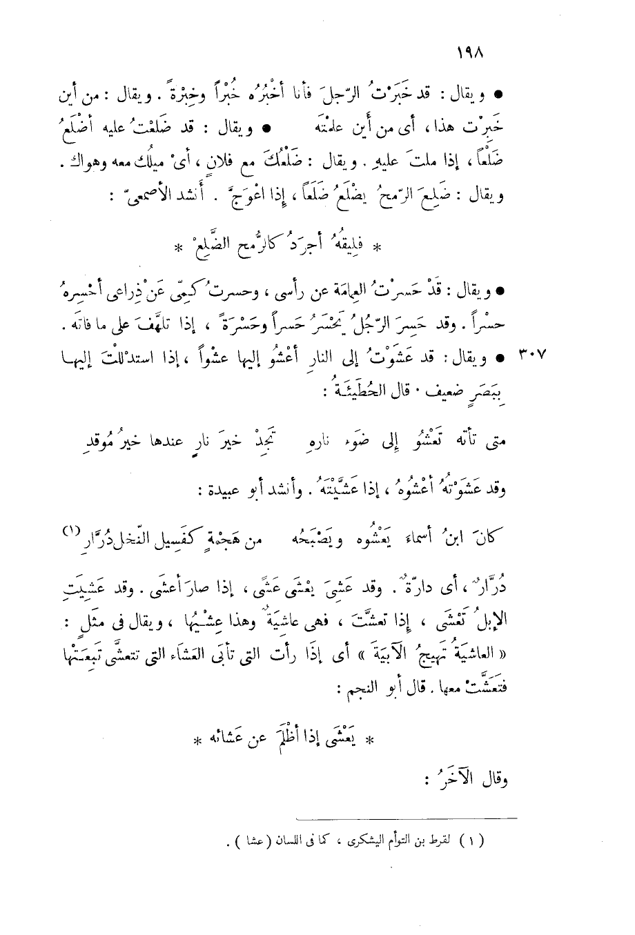 درار أي دارة وقد عشى يعشى عشى إذا صار أعشى وقد عشيت الإبل تعشى إذا تعشت فهي عايشة وهذا عشيها