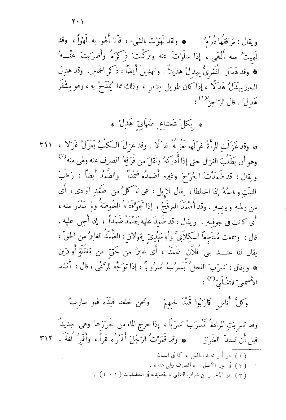 ويقال مرافقها درم ولقد لهوت بالشيء فأنا ألهو به لهوا وقد لهيت منه ألهي إذا سلوت عنه وتركت ذكره وأضربت عنه وقد هدل القمري يهدل هديلا والهديل أيضا ذكر الحمام وقد هدل البعير يهدل هدلا إذا كان طويل المشفر وذلك مما يمدح به وهو مشفر هدل قال الراجز