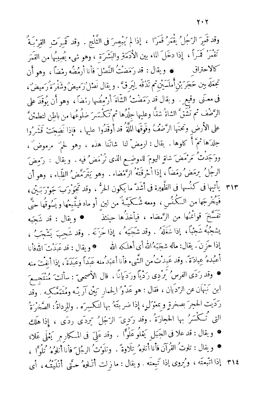 ويقال قد عبدت الله فأنا أعبده عبادة وقد عبدت من الشيء فأنا أعبد منه عبدا وعبدة إذا أنفت منه وقد ردى الفرس يردي رديا ورديانا قال الأصمعي سألت منتجع بن نبهان عن الرديان فقال هو عدو الحمار بين آريه ومتمعكه وقد رديت الحجر بصخرة وبمعول إذا ضربته بها لتكسره والمرداة الصخرة التي تكسر بها الحجارة وقد ردى الرجل يردى ردى إذا هلك
