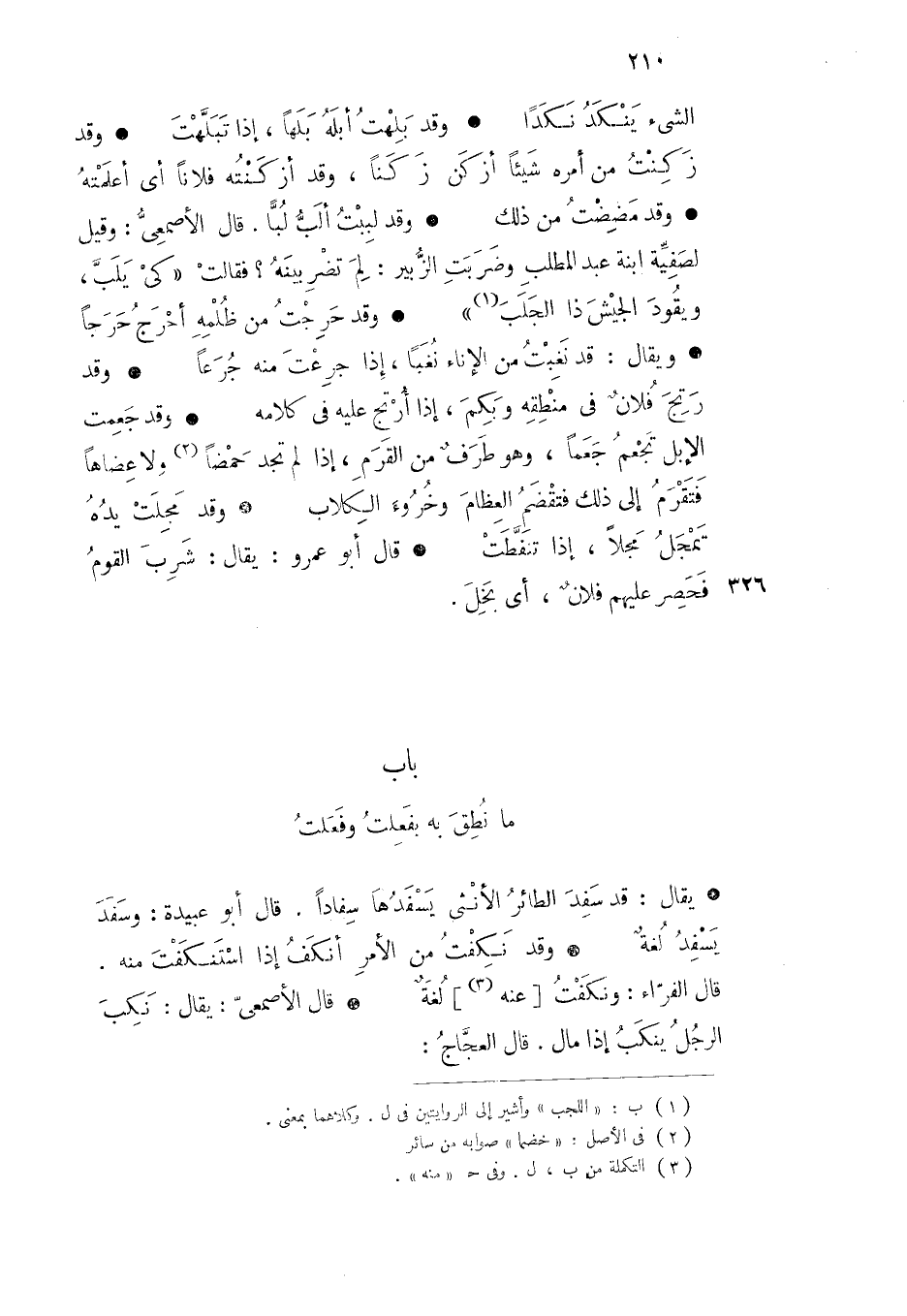 الشيء ينكد نكدا وقد بلهت أبله بلها إذا تبلهت وقد زكنت من أمره شيئا أزكن زكنا وقد أزكنته فلانا أي أعلمته وقد مضضت من ذلك وقد لببت ألب لبا قال الأصمعي وقيل لصفية ابنة عبد المطلب وضربت الزبير لم تضربينه فقالت كي يلب ويقود الجيش ذا الجلب وقد حرجت من ظلمه أحرج حرجا