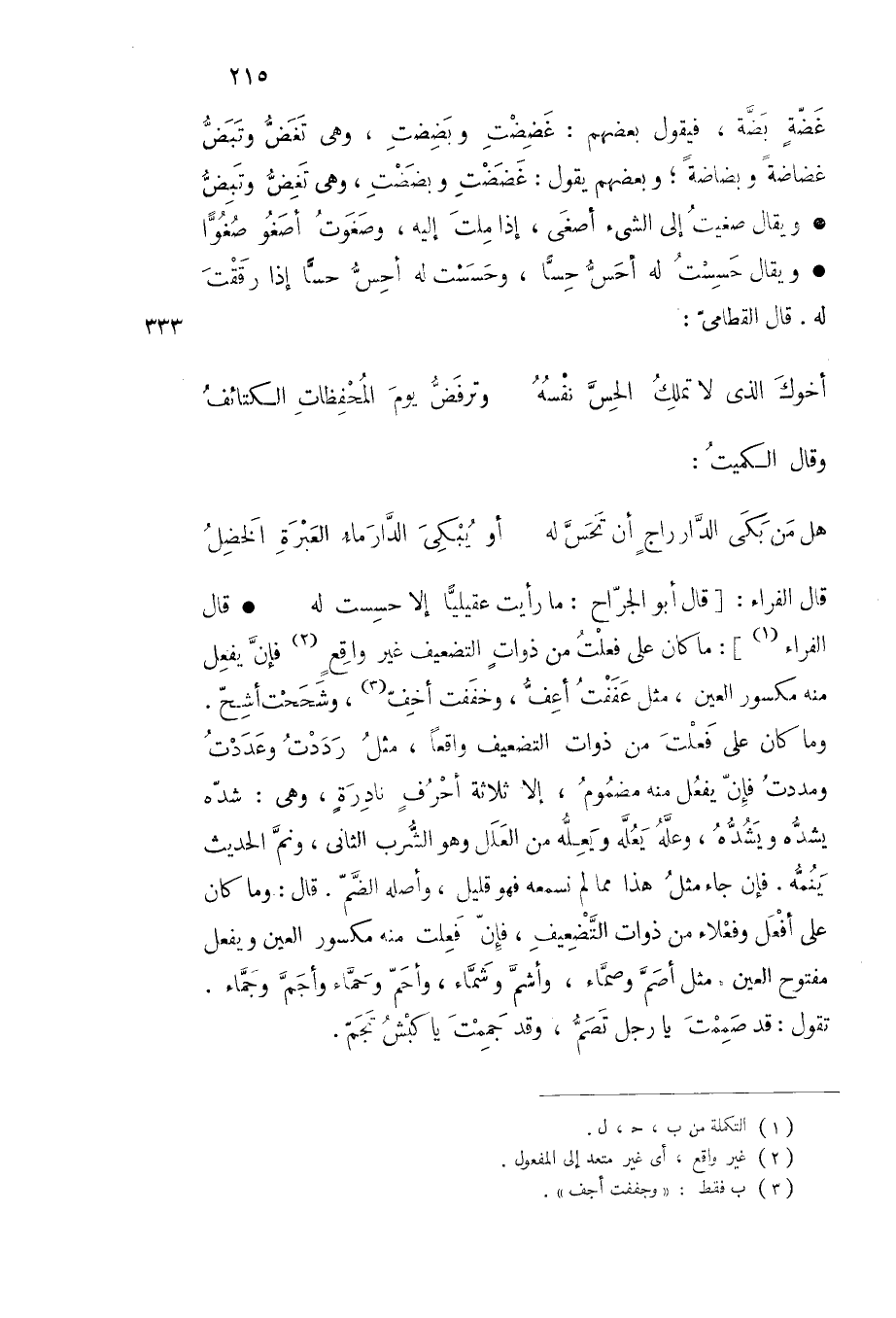 قال الفراء قال أبو الجراح ما رأيت عقيليا إلا حسست له قال الفراء ما كان على فعلت من ذوات التضعيف غير واقع فإن يفعل منه مكسور العين مثل عففت أعف وخففت أخف وشححت أشح وما كان على فعلت من ذوات التضعيف واقعا مثل رددت وعددت ومددت فإن يفعل منه مضموم إلا ثلاثة أحرف نادرة وهي شده يشده ويشده وعله يعله ويعله من العلل وهو الشرب الثاني ونم الحديث ينمه فإن جاء مثل هذا مما لم نسمعه فهو قليل وأصله الضم قال وما كان على أفعل وفعلاء من ذوات التضعيف فإن فعلت منه مكسور العين ويفعل على أفعل وفعلاء من ذوات التضعيف فإن فعلت منه مكسور العين ويفعل مفتوح العين مثل أصم وصماء وأشم وشماء وأحم وحماء وأجم وجماء تقول قد صممت يا رجل تصم وقد جممت يا كبش تجم