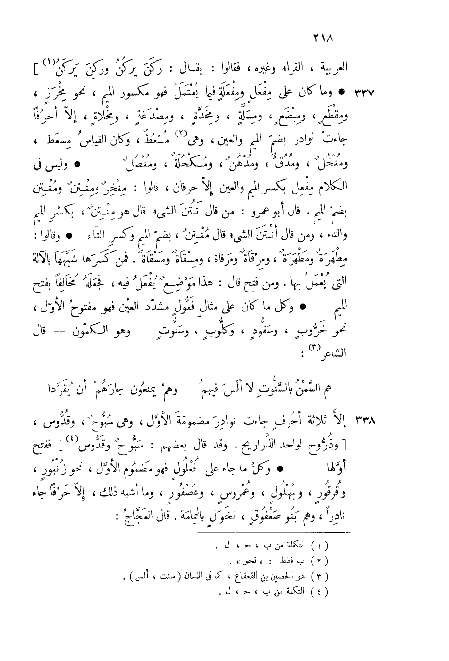 العربية الفراء وغيره فقالوا يقال ركن يركن وركن يركن وما كان على مفعل ومفعلة فيما يعتمل فهو مكسور الميم نحو مخرز ومقطع ومبضع ومسلة ومخدة ومصدغة ومخلاة إلا أحرفا جاءت نوادر بضم الميم والعين وهي مسعط وكان القياس مسعط ومنخل ومدق ومدهن ومكحلة ومنصل وليس في الكلام مفعل بكسر الميم والعين إلا حرفان قالوا منخر ومنتن ومنتن بضم الميم قال أبو عمرو من قال نتن الشيء قال هو منتن بكسر الميم والتاء ومن قال أنتن الشيء قال منتن بضم الميم وكسر التاء وقالوا مطهرة ومطهرة ومرقاة ومرقاة ومسقاة ومسقاة فمن كسرها شبهها بالآلة التي يعمل بها ومن فتح قال هذا موضع يفعل فيه فجعله مخالفا بفتح الميم وكل ما كان على مثال فعول مشدد العين فهو مفتوح الأول نحو خروب وسفود وكلوب وسنوت وهو الكمون قال الشاعر