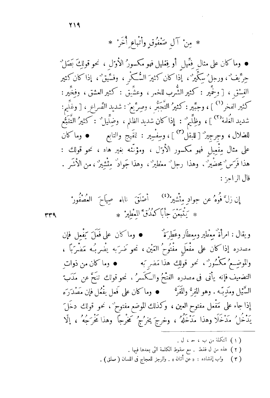 وما كان على مثال فعيل أو فعليل فهو مكسور الأول نحو قولك بصل حريف ورجل سكير إذا كان كثير السكر وفسيق إذا كان كثير الفسق وخمير كثير الشرب للخمر وعشيق كثير العشق وفخير كثير الفخر وجبير كثير التجبر وصريع شديد الصراع وغليم شديد الغلمة وظليم إذا كان شديد الظلم وضليل كثير التتبع للضلال وجرجير للبقل وسفسير للفيج والتابع وما كان على مثال مفعيل فهو مكسور الأول ومؤنثه بغير هاء نحو قولك هذا فرس محضير وهذا رجل معطير وهذا جواد مئشير من الأشر قال الراجز