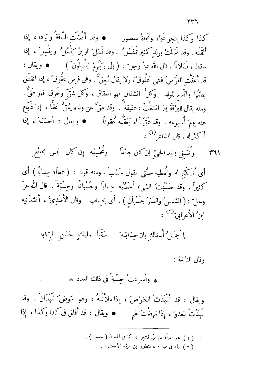أي نكثر له ونعطيه حتى يقول حسب ومنه قوله ( عطاء حسابا ) أي كثيرا وقد حسبت الشيء أحسبه حسابا وحسبانا وحسبة قال الله عز وجل ( الشمس والقمر بحسبان ) أي بحساب وقال الأسدي أنشدنيه ابن الأعرابي