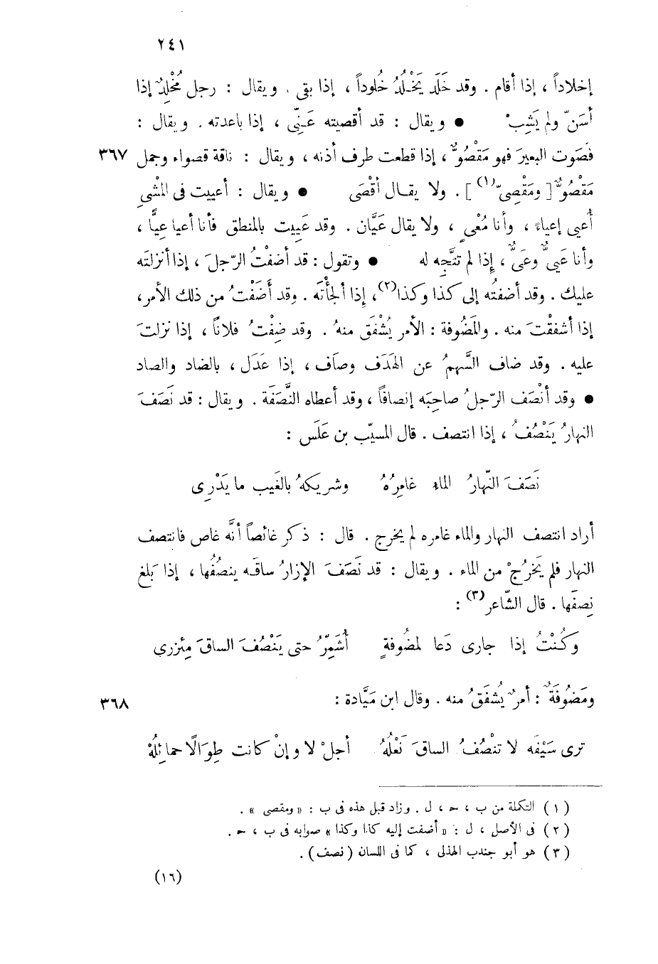 ويقال أعييت في المشي أعيى إعياء وأنا معي ولا يقال عيان وقد عييت بالمنطق فأنا أعيا عيا وأنا عيي وعي إذا لم تتجه له وتقول قد أضفت الرجل إذا أنزلته عليك وقد أضفته إلى كذا وكذا إذا ألجأته وقد أضفت من ذلك الأمر إذا أشفقت منه والمضوفة الأمر يشفق منه وقد ضفت فلانا إذا نزلت عليه وقد ضاف السهم عن الهدف وصاف إذا عدل بالضاد والصاد وقد أنصف الرجل صاحبه إنصافا وقد أعطاه النصفة