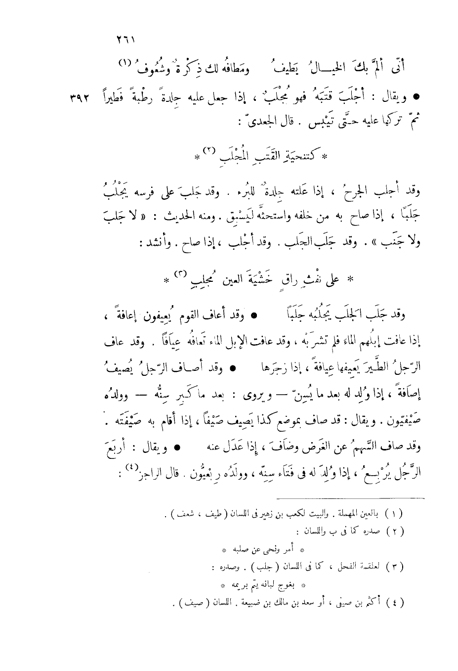 وقد جلب الجلب يجلبه جلبا وقد أعاف القوم يعيفون إعافة إذا عافت إبلهم الماء فلم تشربه وقد عافت الإبل الماء تعافه عيافا وقد عاف الرجل الطير يعيفها عيافة إذا زجرها وقد أصاف الرجل يصيف إصافة إذا ولد له بعد ما يسن ويروى بعدما كبر سنه وولده صيفيون