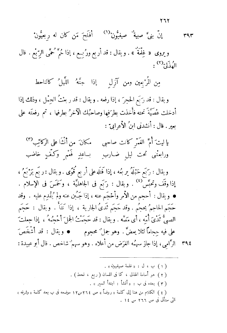 ويقال قد ربعت الحمل وذلك إذا أدخلت عصية تحته فأخذت بطرفها وصاحبك الآخر يطرفها بطرفها ثم رفعته على بعير قال أنشدني ابن الأعرابي