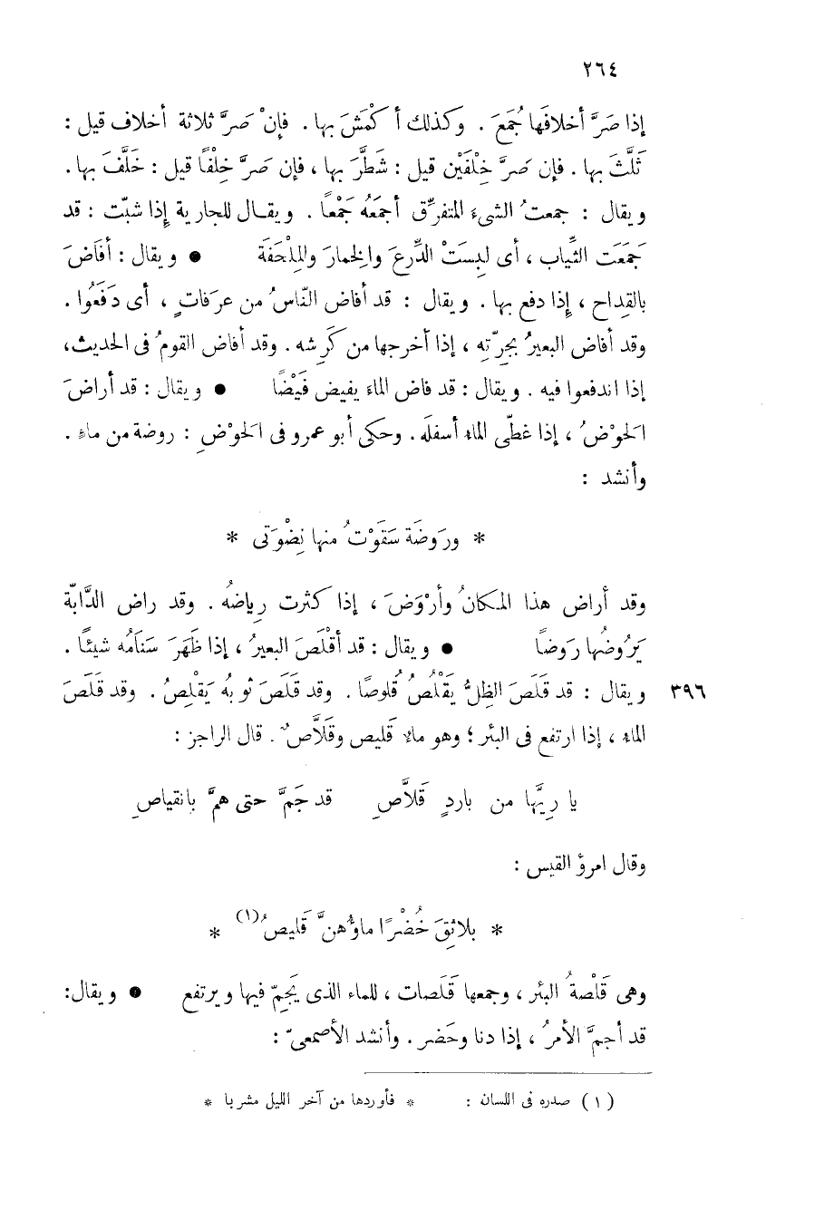 ويقال قد أفاض الناس من عرفات أي دفعوا وقد أفاض البعير بجرته إذا أخرجها من كرشه وقد أفاض القوم في الحديث إذا اندفعوا فيه