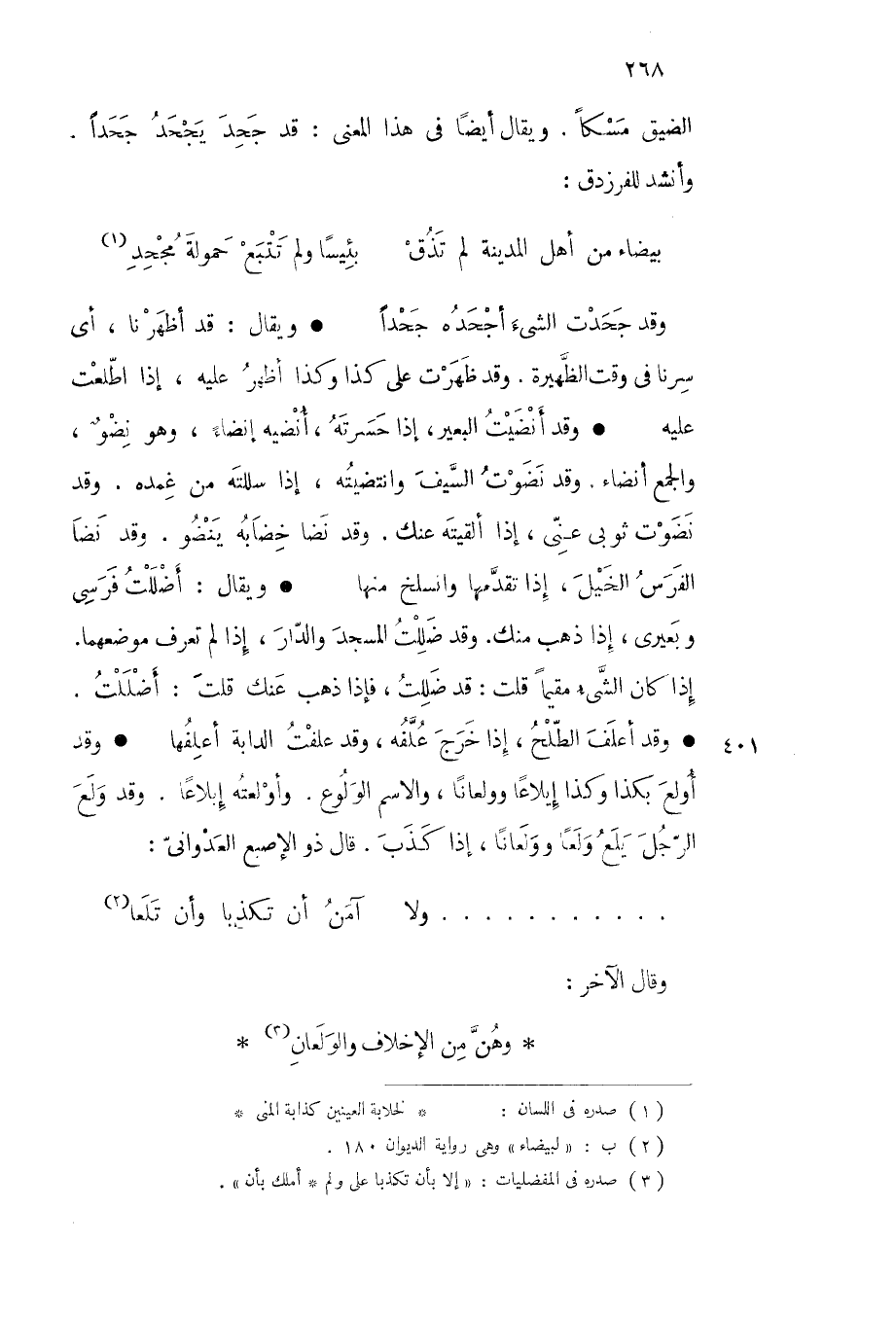 ويقال أضللت فرسي وبعيري إذا ذهب منك وقد ضللت المسجد والدار إذا لم تعرف موضعهما إذا كان الشيء مقيما قلت قد ضللت فإذا ذهب عنك قلت أضللت وقد أعلف الطلح إذا خرج علفه وقد علفت الدابة أعلفها وقد أولع بكذا وكذا إيلاعا وولعانا والاسم الولوع وأولعته إيلاعا وقد ولع الرجل يلع ولعا وولعانا إذا كذب قال ذو الإصبع العدواني